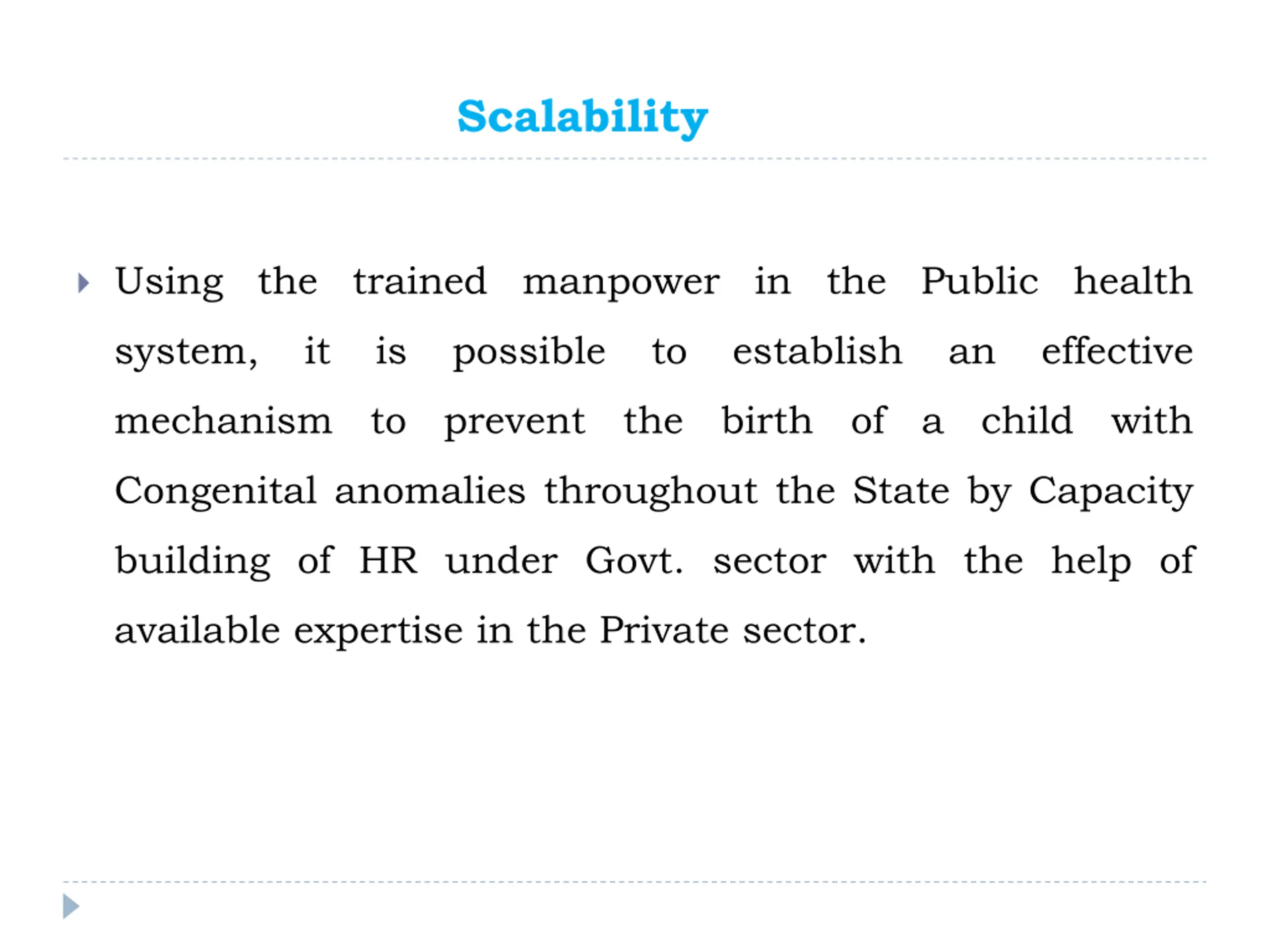 Scalability Using the trained manpower in the Public health system, it is possible to establish an effective mechanism to prevent the birth of a child with Congenital anomalies throughout the State by Capacity building of HR under Govt. sector with the help of available expertise in the Private sector.