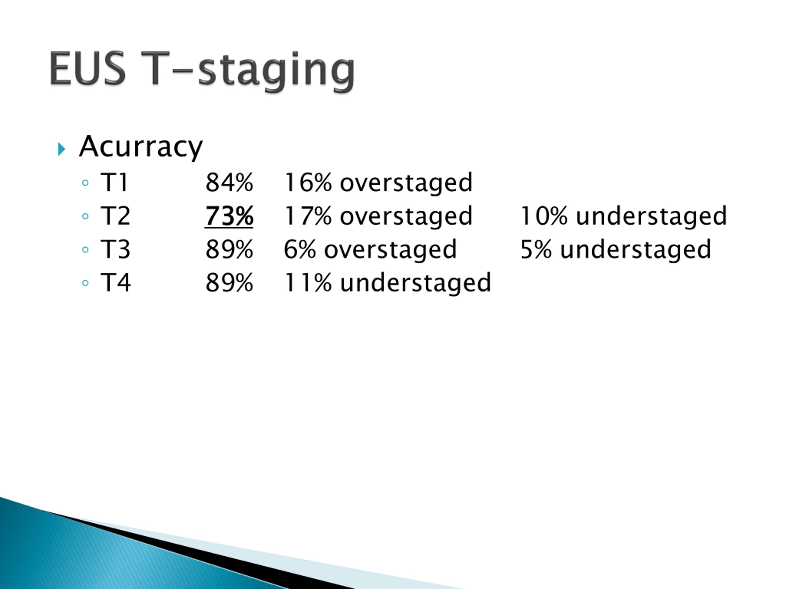 Acurracy T1 T2 T3 T4 84% 73% 89% 89% 16% overstaged 17% overstaged 6% overstaged 11% understaged 73% 10% understaged 5% understaged