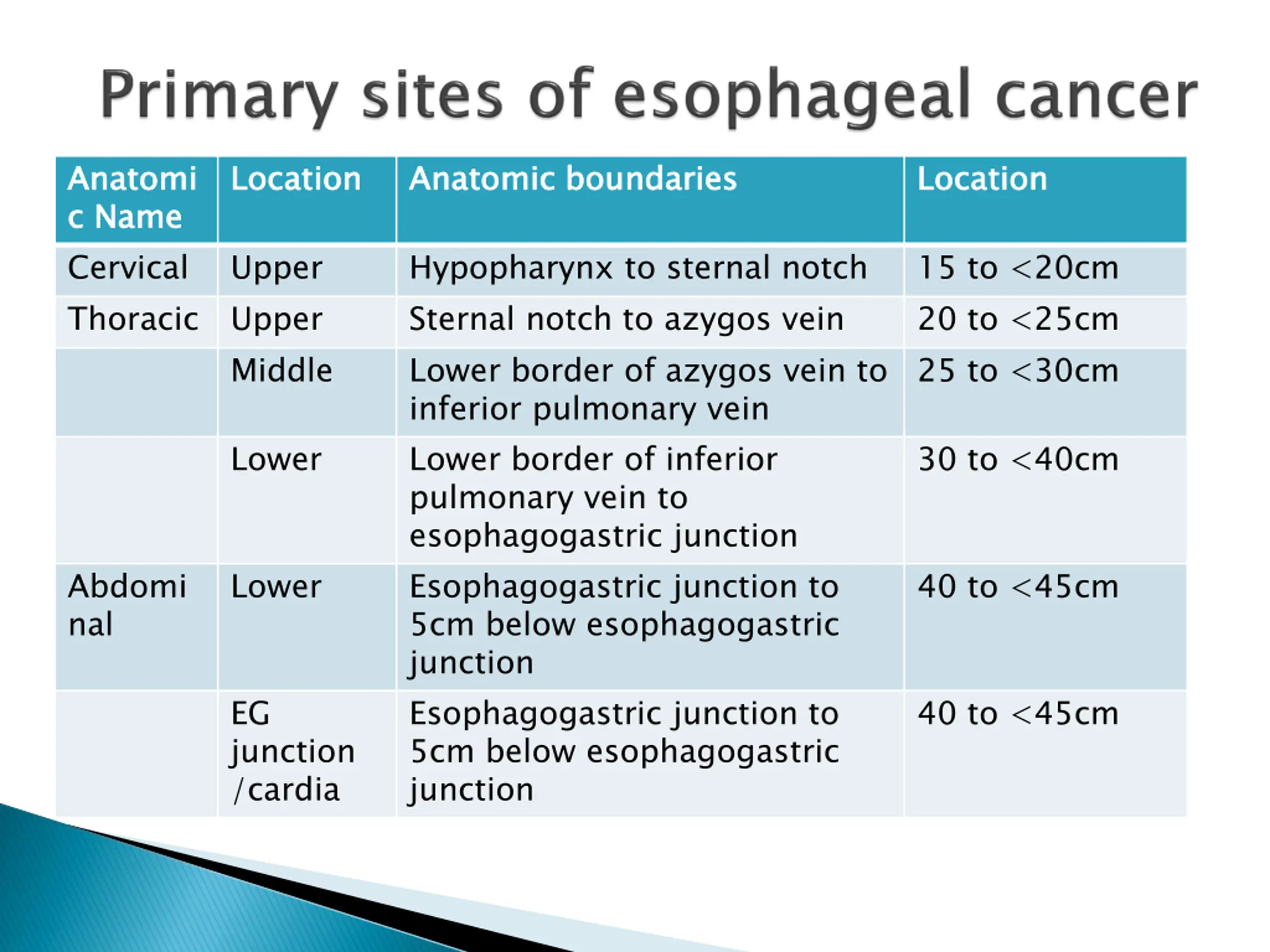 Anatomi c Name Cervical Thoracic Anatomi c Name Location Location Anatomic Anatomic boundaries boundaries Location Location Upper Upper Middle Hypopharynx to sternal notch Sternal notch to azygos vein Lower border of azygos vein to inferior pulmonary vein Lower border of inferior pulmonary vein to esophagogastric junction Esophagogastric junction to 5cm below esophagogastric junction Esophagogastric junction to 5cm below esophagogastric junction 15 to <20cm 20 to <25cm 25 to <30cm Lower 30 to <40cm Abdomi nal Lower 40 to <45cm EG junction /cardia 40 to <45cm