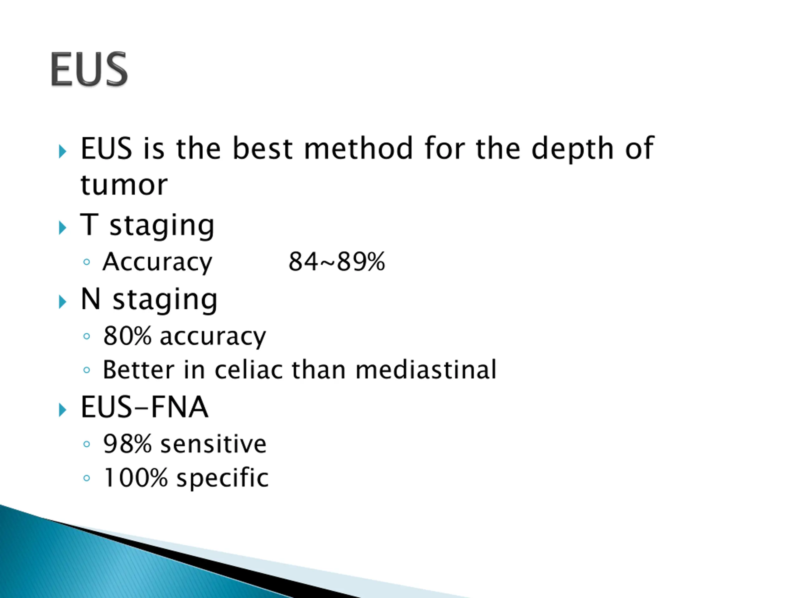 EUS is the best method for the depth of tumor T staging Accuracy N staging 80% accuracy Better in celiac than mediastinal EUS-FNA 98% sensitive 100% specific 84~89%