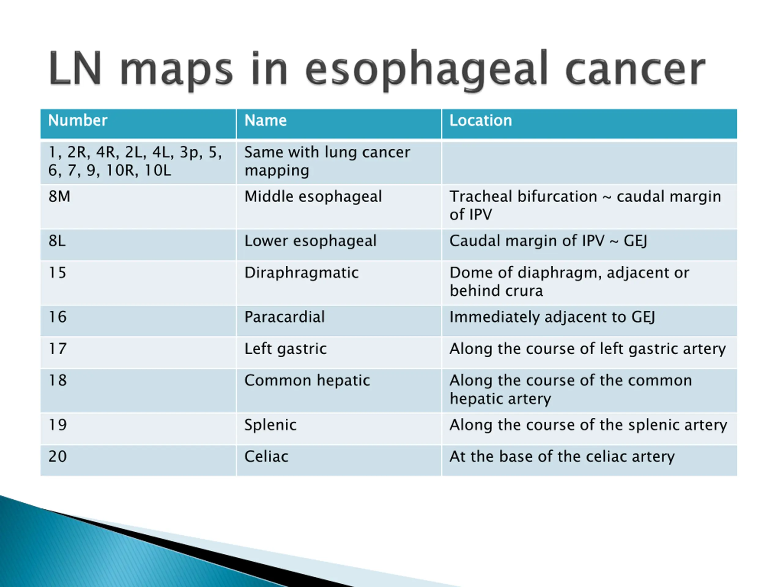 Number Number Name Name Location Location 1, 2R, 4R, 2L, 4L, 3p, 5, 6, 7, 9, 10R, 10L 8M Same with lung cancer mapping Middle esophageal Tracheal bifurcation ~ caudal margin of IPV Caudal margin of IPV ~ GEJ 8L Lower esophageal 15 Diraphragmatic Dome of diaphragm, adjacent or behind crura Immediately adjacent to GEJ 16 Paracardial 17 Left gastric Along the course of left gastric artery 18 Common hepatic Along the course of the common hepatic artery Along the course of the splenic artery 19 Splenic 20 Celiac At the base of the celiac artery