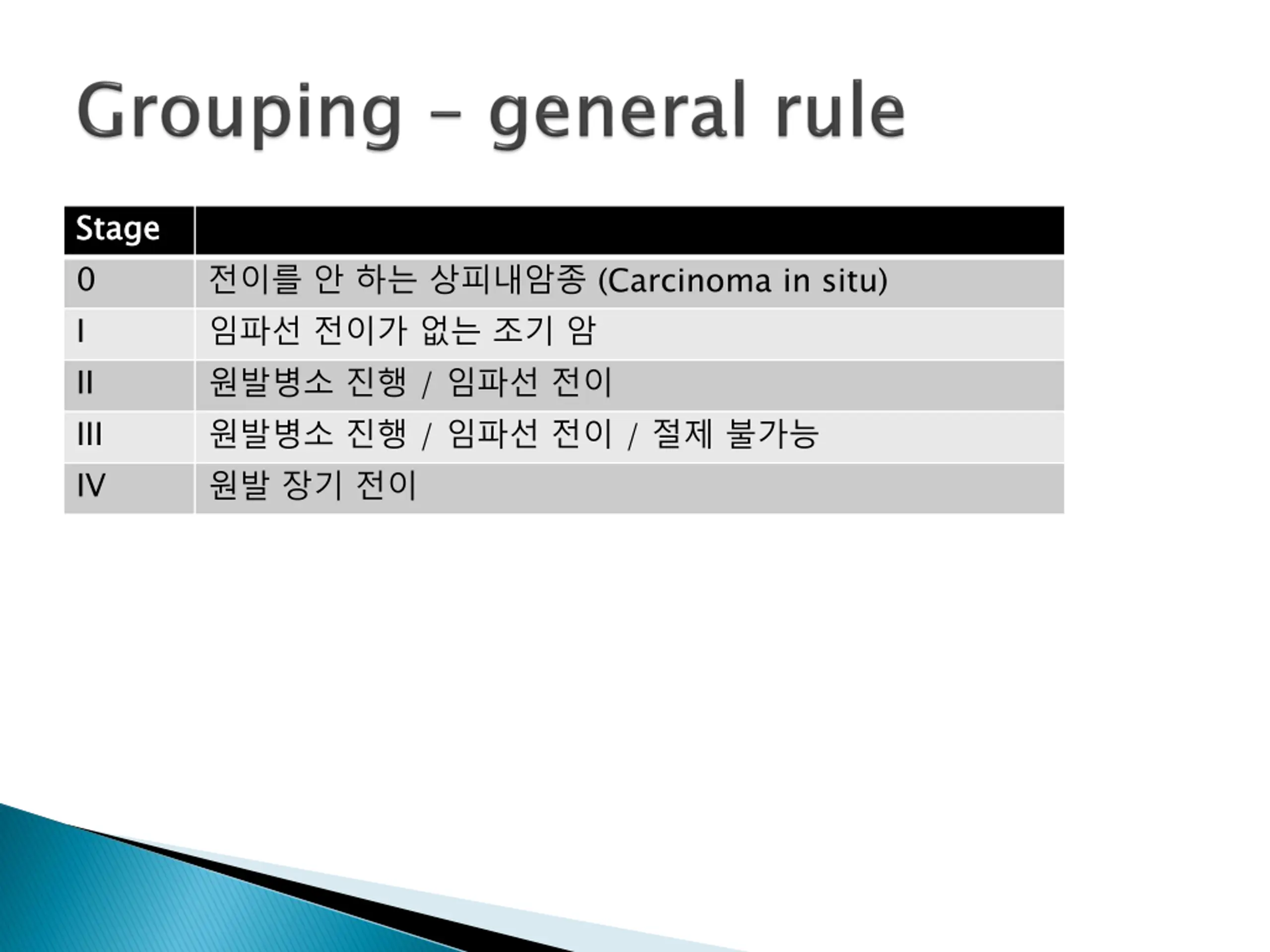 Group T 0 IA IB N N0 N0 N0 N0 N0 N0 N0 N1 N2 N1 N0 N2 N1-2 Any N3 Any M M0 M0 M0 M0 M0 M0 M0 M0 M0 M0 M0 M0 M0 M0 M0 M1 Grade 1 1,X 2-3 1,X 1,X 2-3 2-3 Any Any Any Any Any Any Any Any Any Location Any Any Any Lower, X Upper, Middle Lower, X Upper, Middle Tis (HGD) T1 T1 T2-3 T2-3 T2-3 T2-3 T1-2 T1-2 T3 T4a T3 T4a T4b Any Any IIA IIB IIIA IIIB IIIC IV
