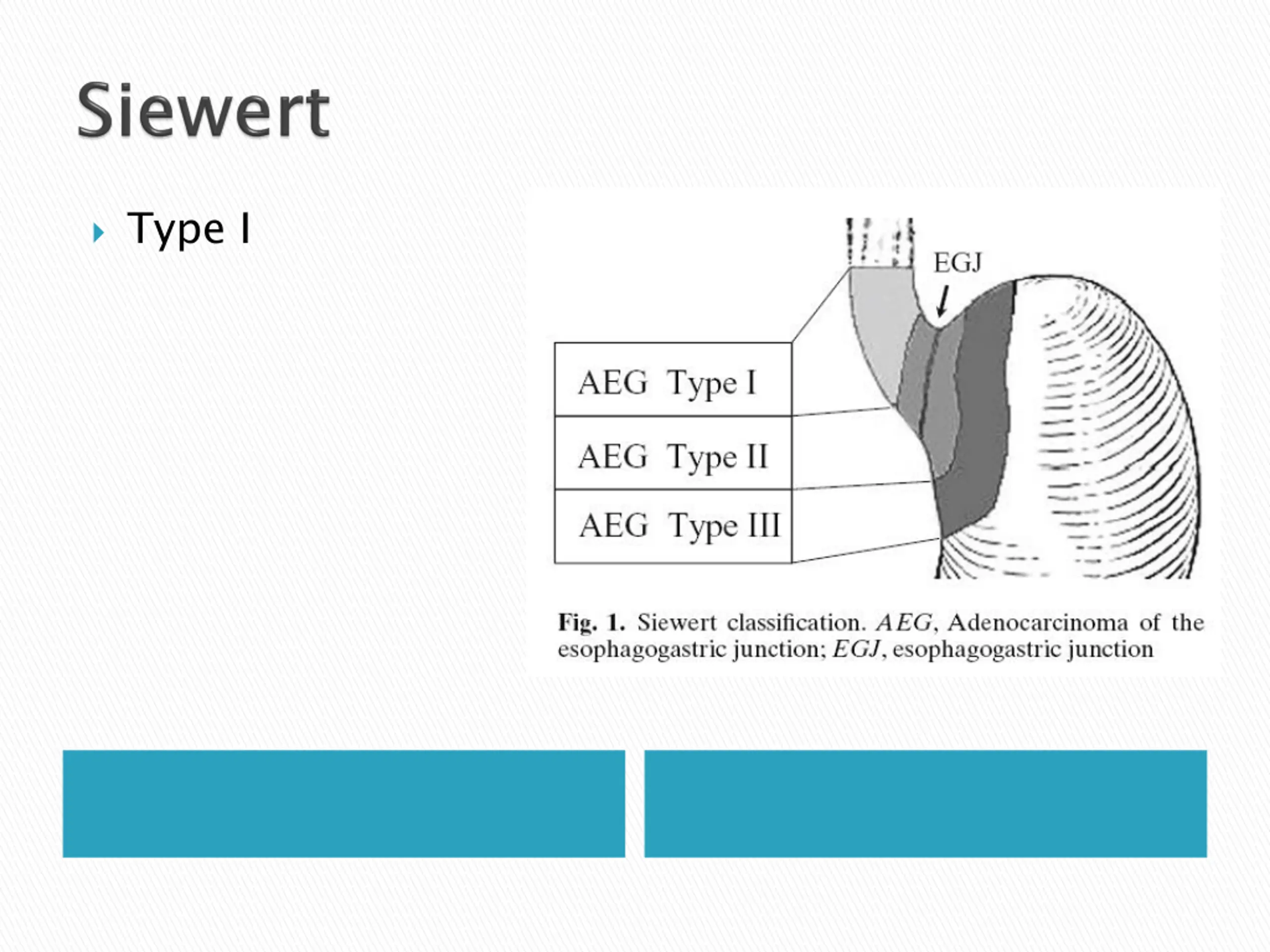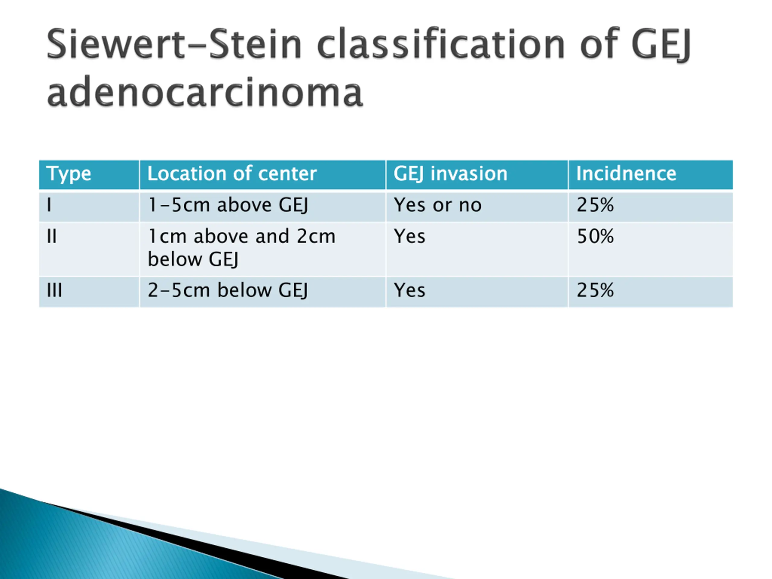 Type I II Type Location of 1-5cm above GEJ 1cm above and 2cm below GEJ 2-5cm below GEJ Location of center center GEJ invasion Yes or no Yes GEJ invasion Incidnence 25% 50% Incidnence III Yes 25%