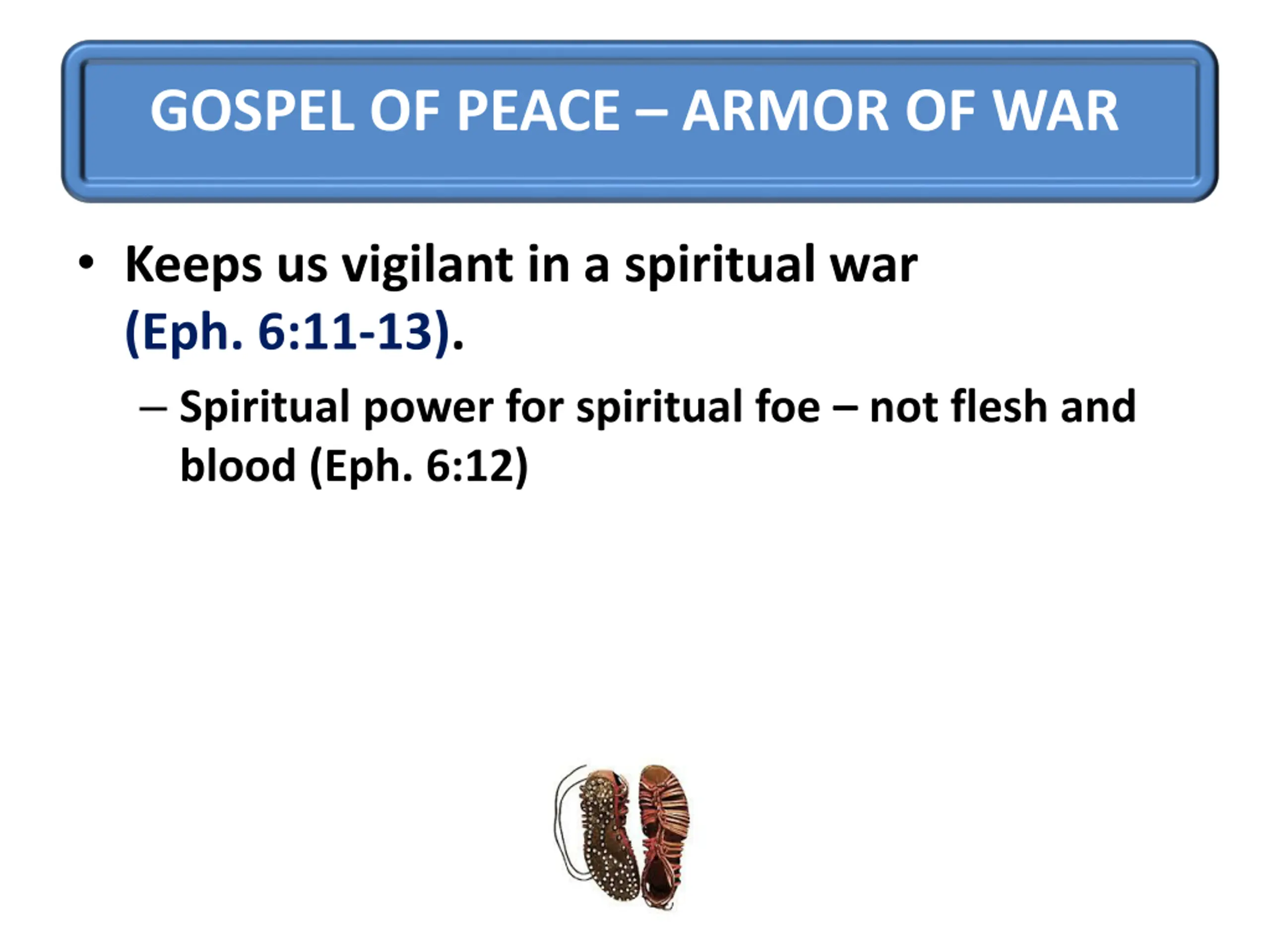 GOSPEL OF PEACE ARMOR OF WAR Keeps us vigilant in a spiritual war (Eph. 6:11-13). Spiritual power for spiritual foe not flesh and blood (Eph. 6:12) https://encrypted-tbn3.gstatic.com/images?q=tbn:ANd9GcT3psZjf9kkWMX0XeTZjhWcou_SxiSnUAIOTK7tpn0FG9mA5LlKKQ