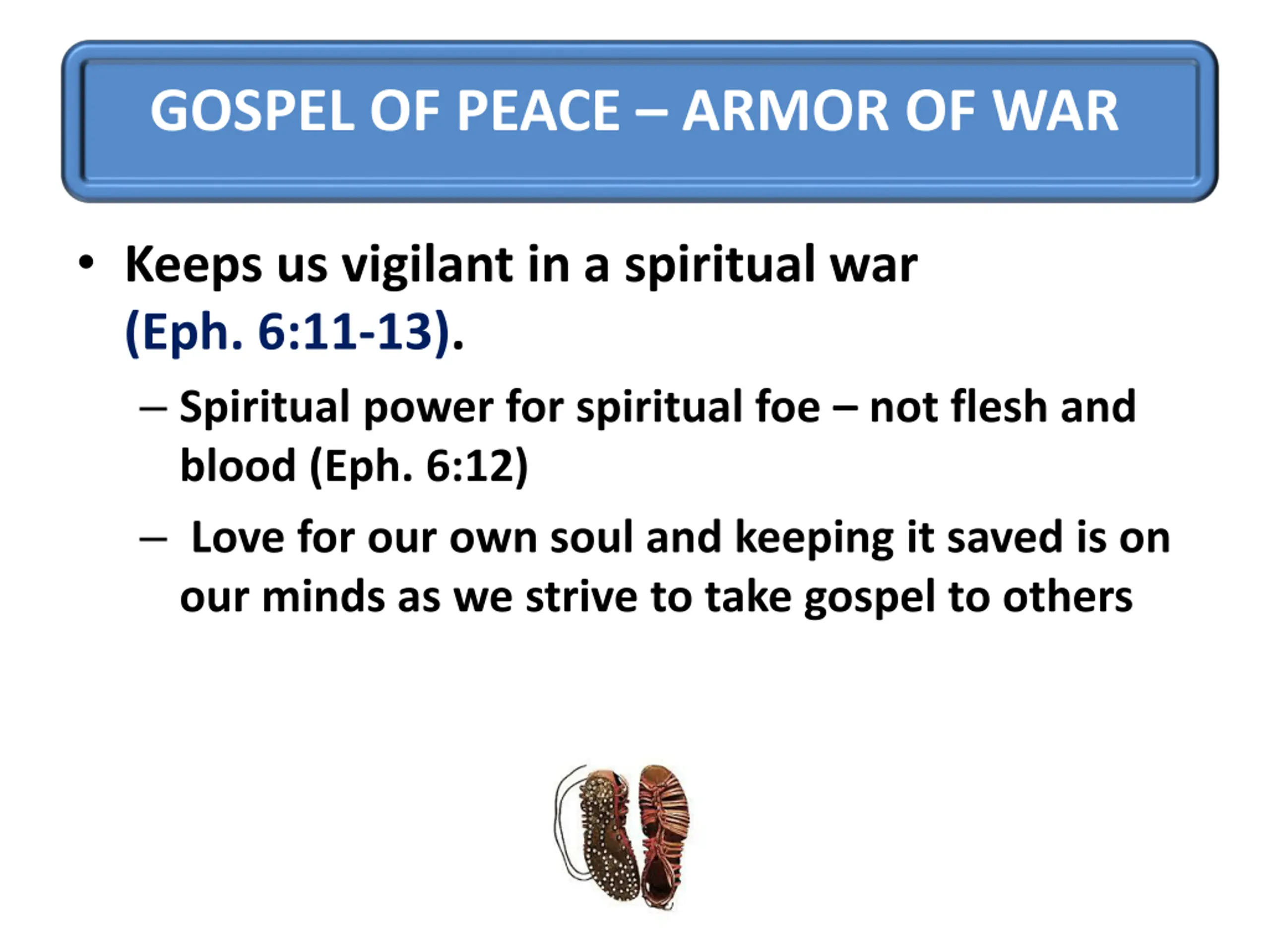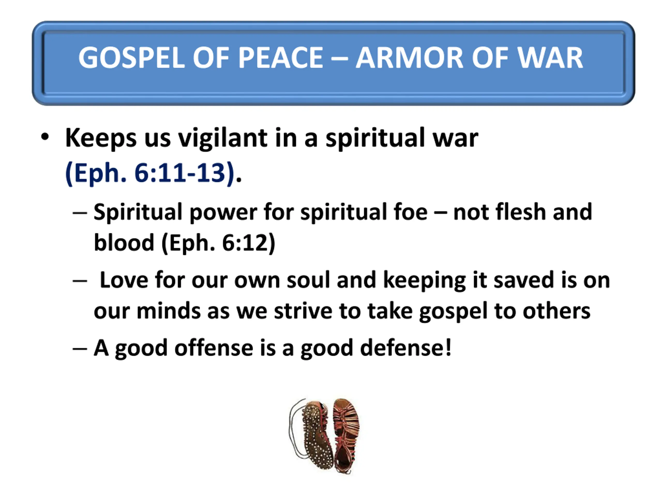 GOSPEL OF PEACE ARMOR OF WAR Keeps us vigilant in a spiritual war (Eph. 6:11-13). Spiritual power for spiritual foe not flesh and blood (Eph. 6:12) Love for our own soul and keeping it saved is on our minds as we strive to take gospel to others A good offense is a good defense! https://encrypted-tbn3.gstatic.com/images?q=tbn:ANd9GcT3psZjf9kkWMX0XeTZjhWcou_SxiSnUAIOTK7tpn0FG9mA5LlKKQ