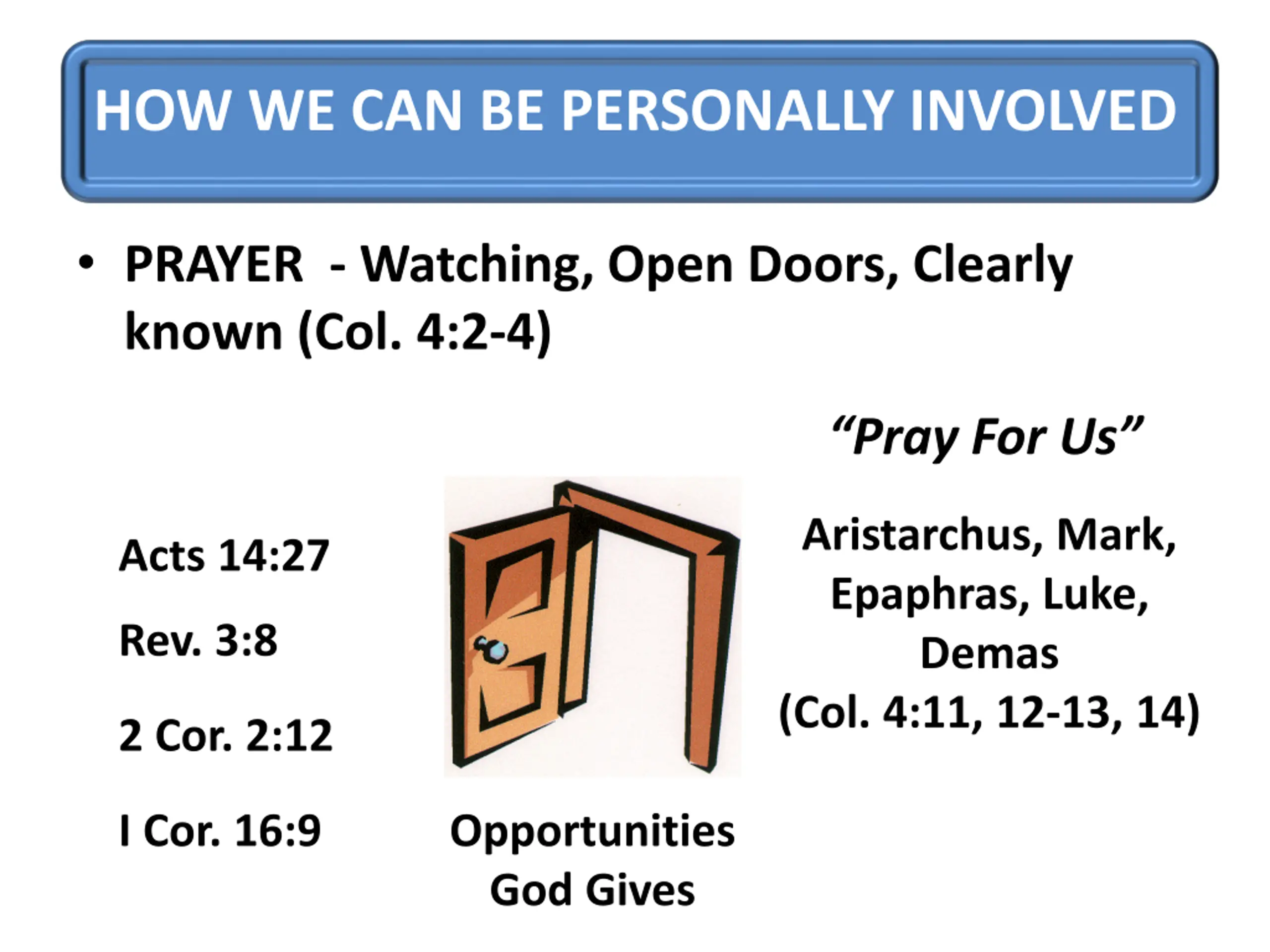 HOW WE CAN BE PERSONALLY INVOLVED PRAYER - Watching, Open Doors, Clearly known (Col. 4:2-4) Pray For Us Aristarchus, Mark, Epaphras, Luke, Demas (Col. 4:11, 12-13, 14) Acts 14:27 Rev. 3:8 2 Cor. 2:12 I Cor. 16:9 Opportunities God Gives