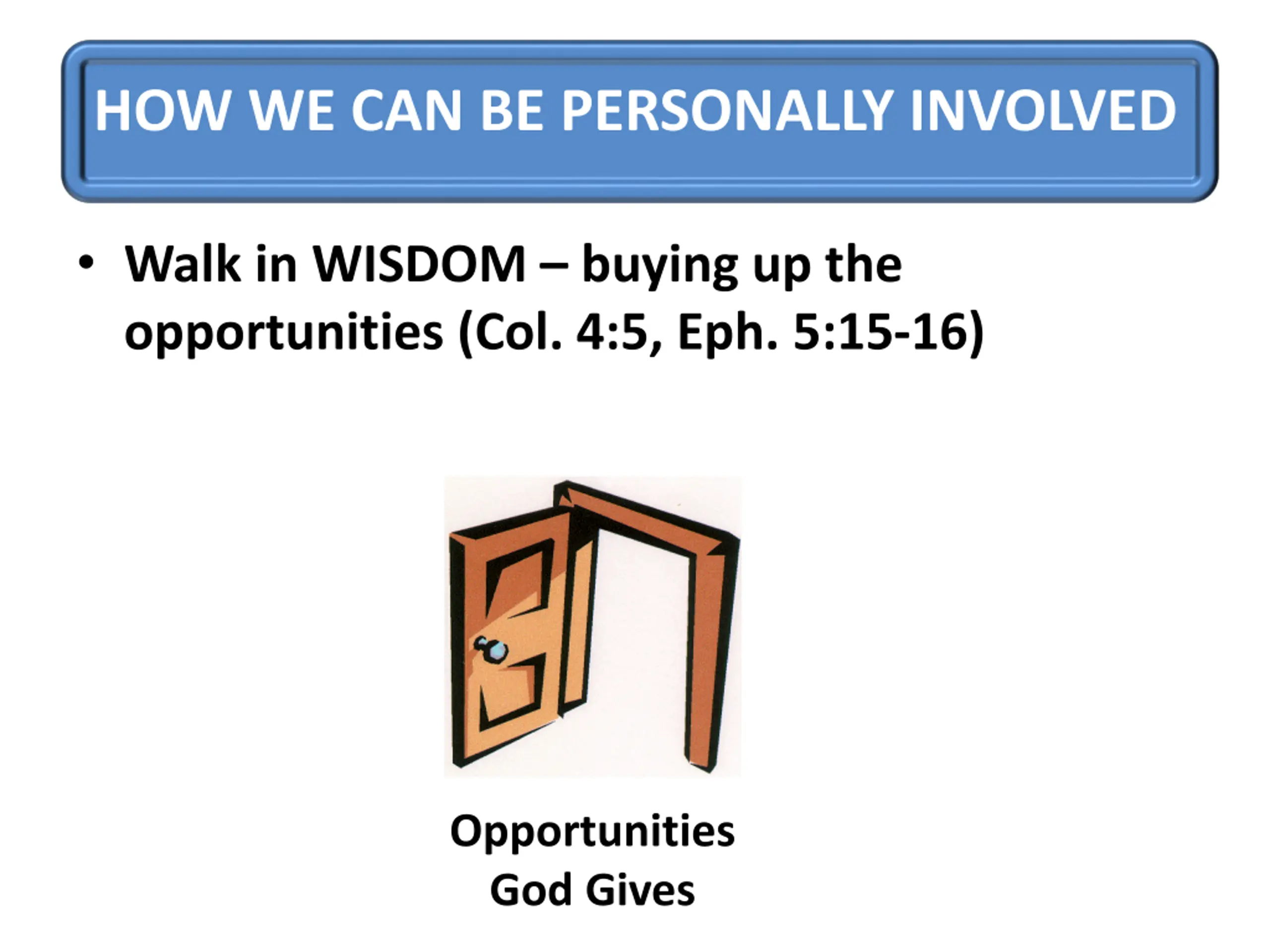 HOW WE CAN BE PERSONALLY INVOLVED Walk in WISDOM buying up the opportunities (Col. 4:5, Eph. 5:15-16) Opportunities God Gives