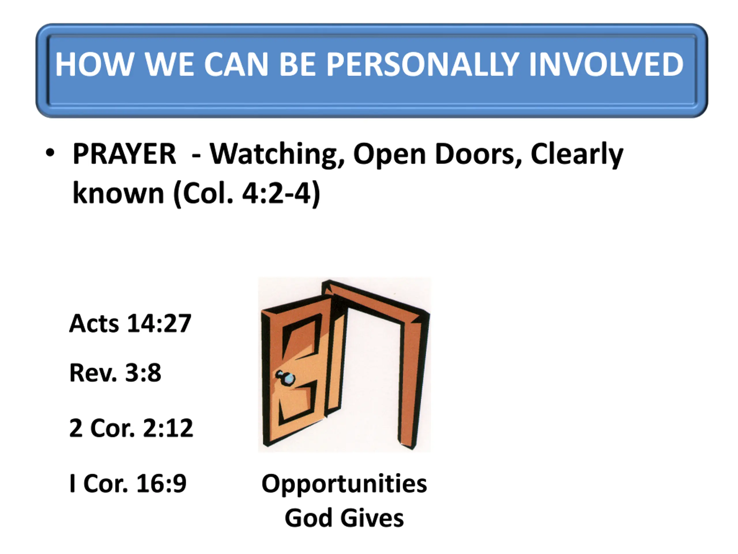HOW WE CAN BE PERSONALLY INVOLVED PRAYER - Watching, Open Doors, Clearly known (Col. 4:2-4) Acts 14:27 Rev. 3:8 2 Cor. 2:12 I Cor. 16:9 Opportunities God Gives