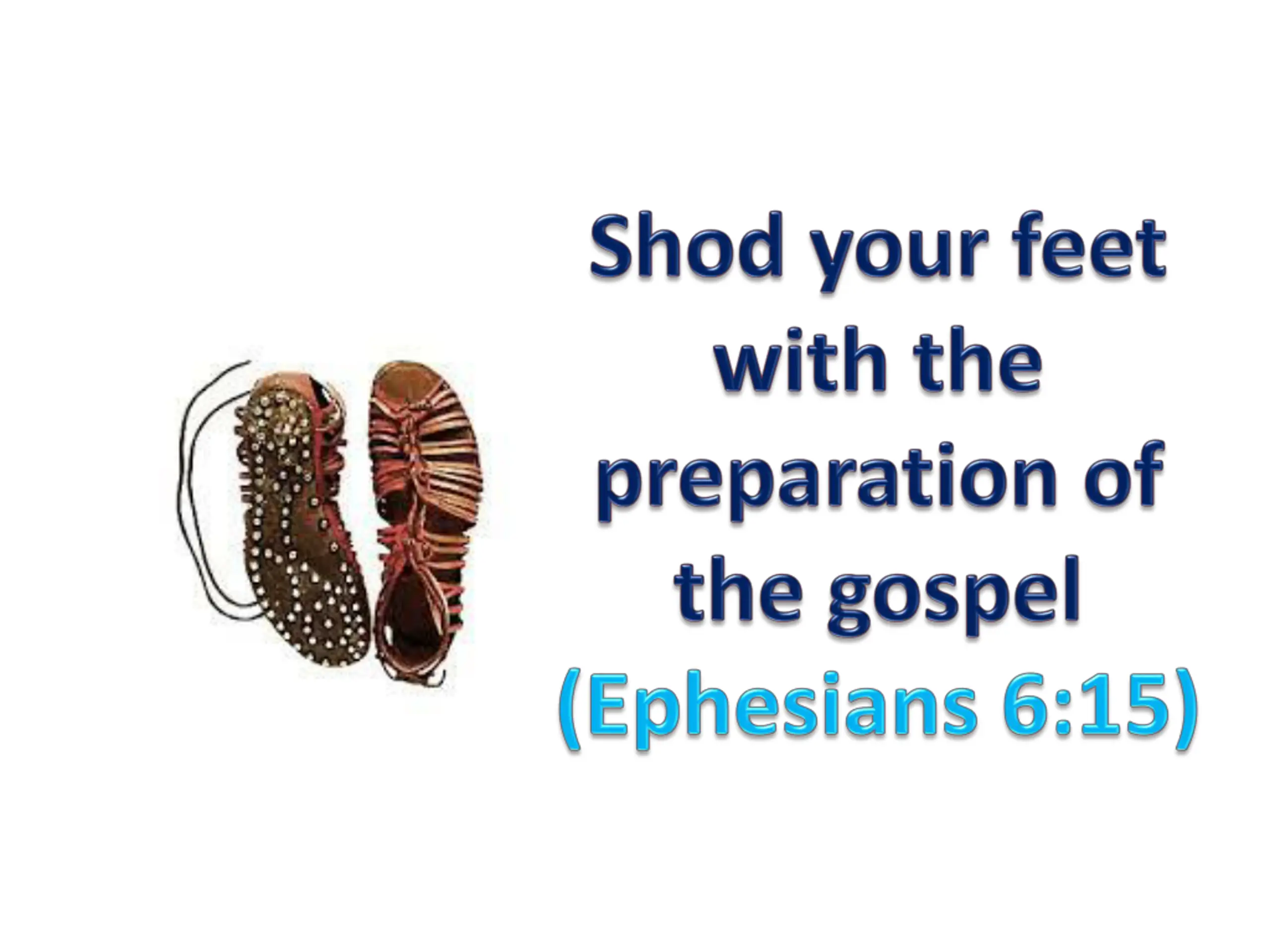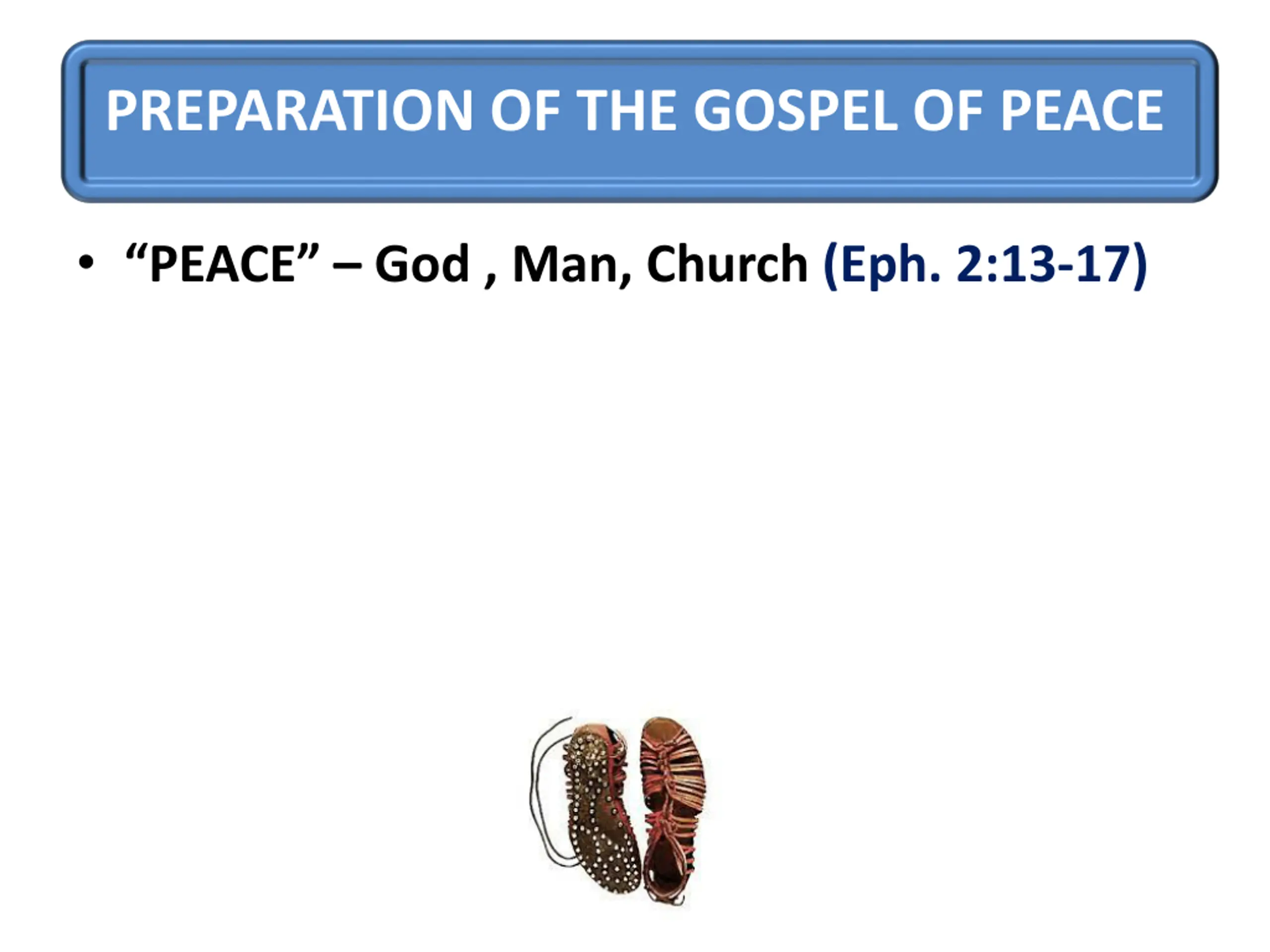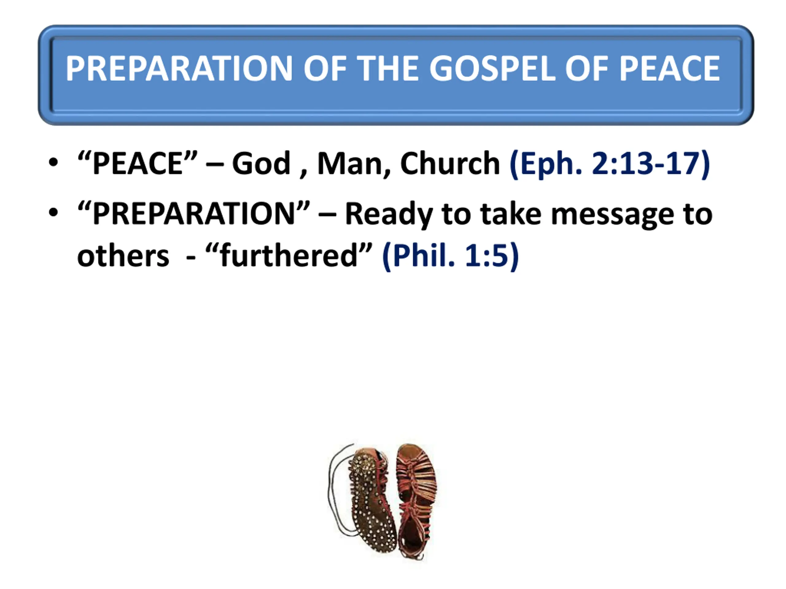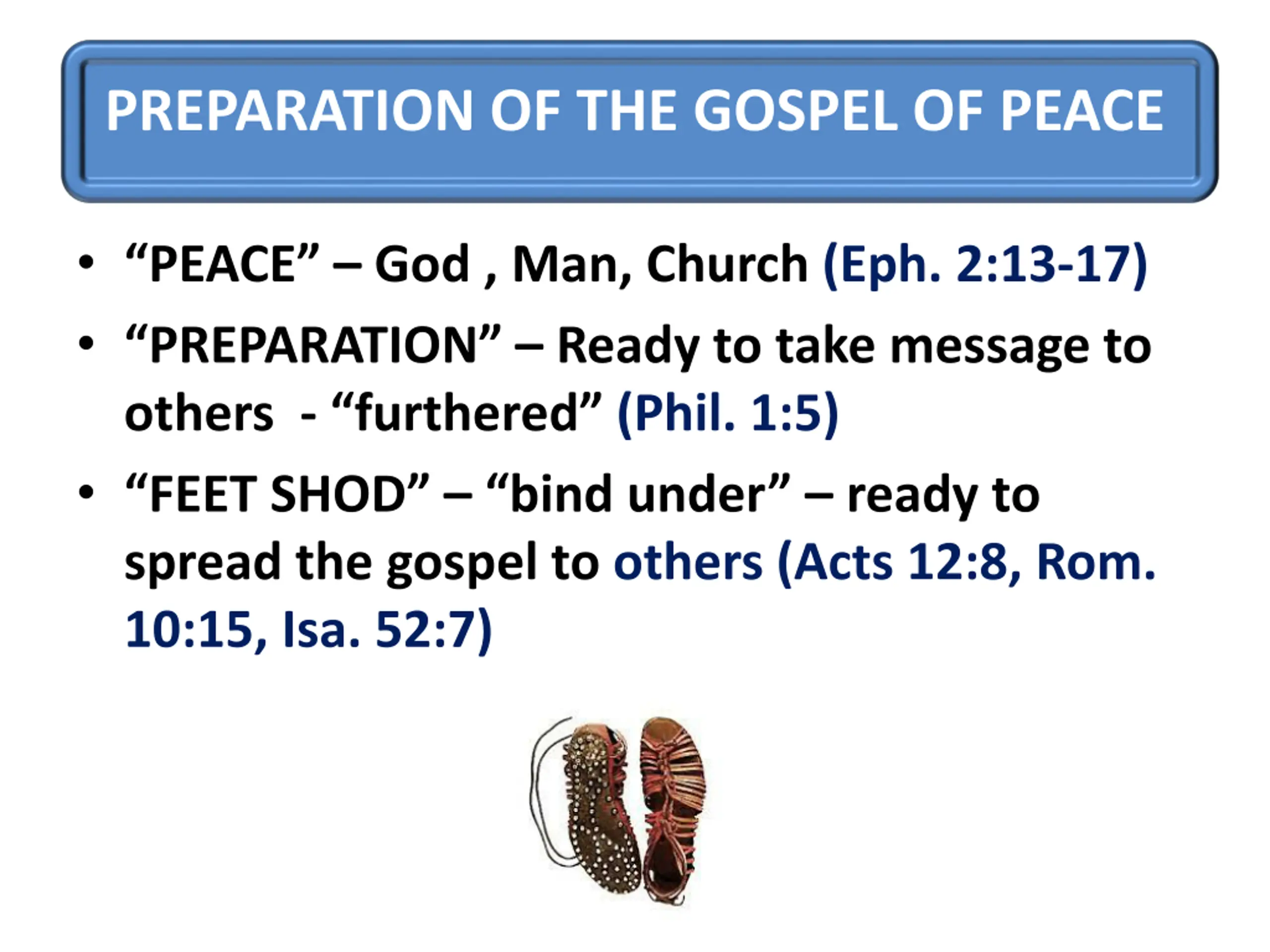 PREPARATION OF THE GOSPEL OF PEACE PEACE God , Man, Church (Eph. 2:13-17) PREPARATION Ready to take message to others - furthered (Phil. 1:5) FEET SHOD bind under ready to spread the gospel to others (Acts 12:8, Rom. 10:15, Isa. 52:7) https://encrypted-tbn3.gstatic.com/images?q=tbn:ANd9GcT3psZjf9kkWMX0XeTZjhWcou_SxiSnUAIOTK7tpn0FG9mA5LlKKQ