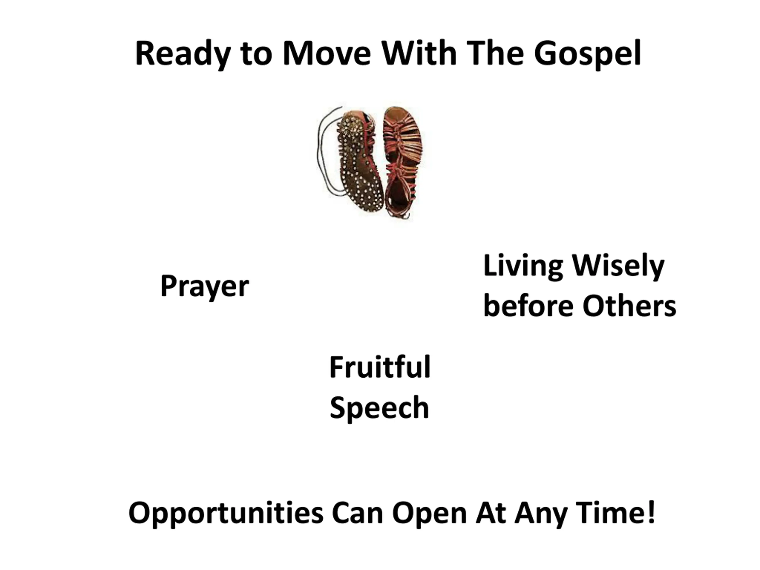 Ready to Move With The Gospel https://encrypted-tbn3.gstatic.com/images?q=tbn:ANd9GcT3psZjf9kkWMX0XeTZjhWcou_SxiSnUAIOTK7tpn0FG9mA5LlKKQ Living Wisely before Others Prayer Fruitful Speech Opportunities Can Open At Any Time!