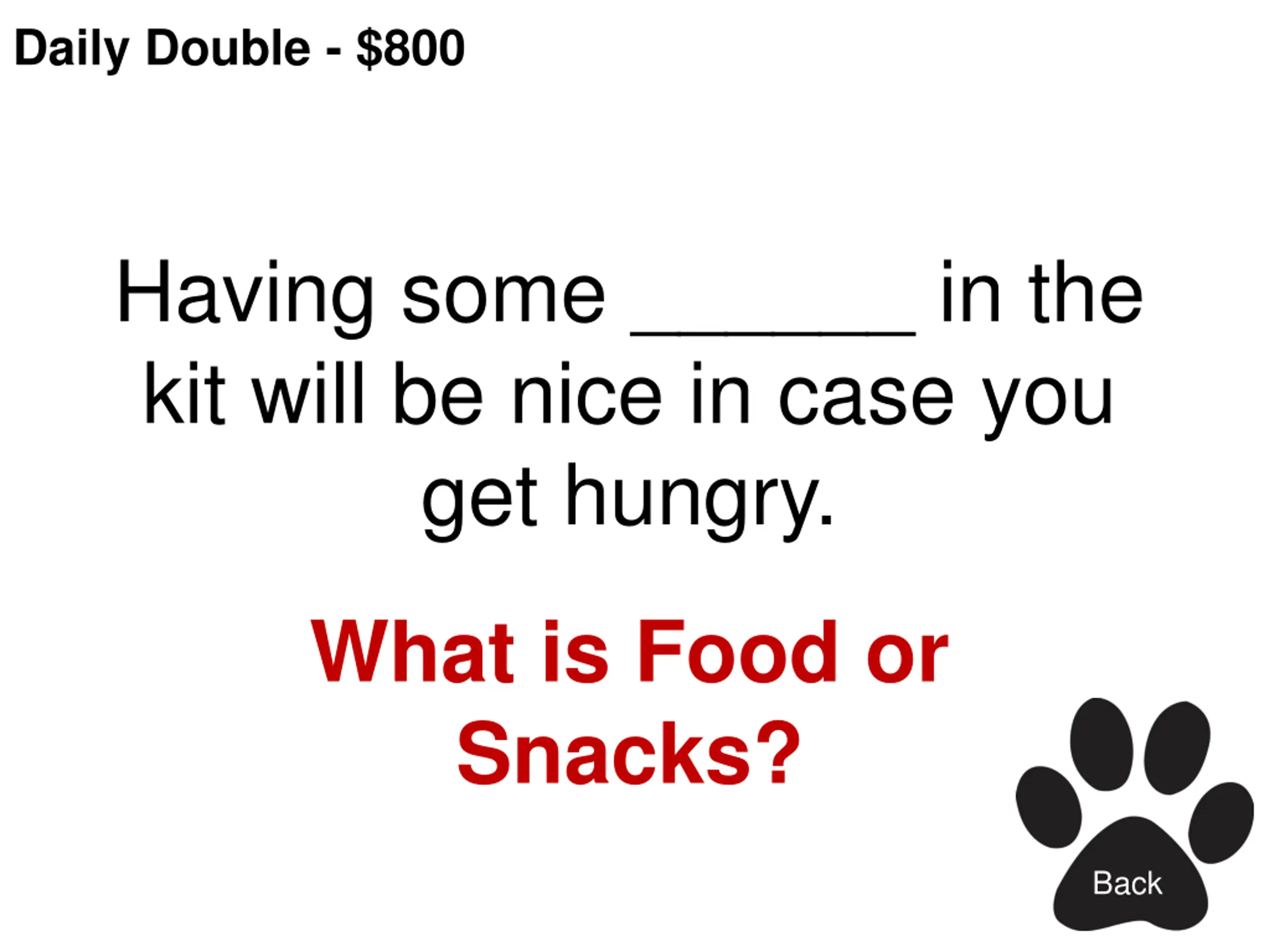 Daily Double - $800 Having some ______ in the kit will be nice in case you get hungry. What is Food or Snacks? Back Back