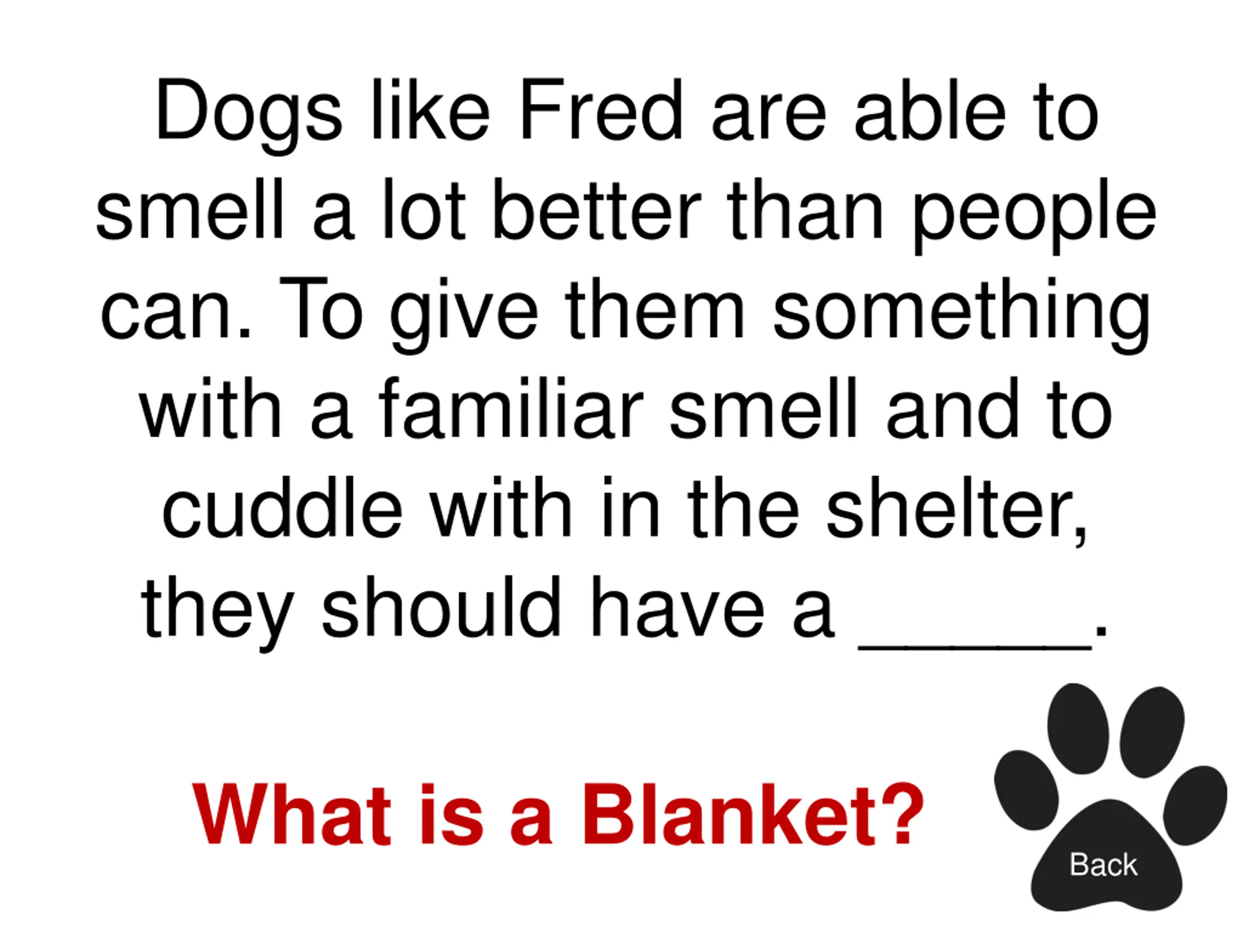 Dogs like Fred are able to smell a lot better than people can. To give them something with a familiar smell and to cuddle with in the shelter, they should have a _____. What is a Blanket? Back Back