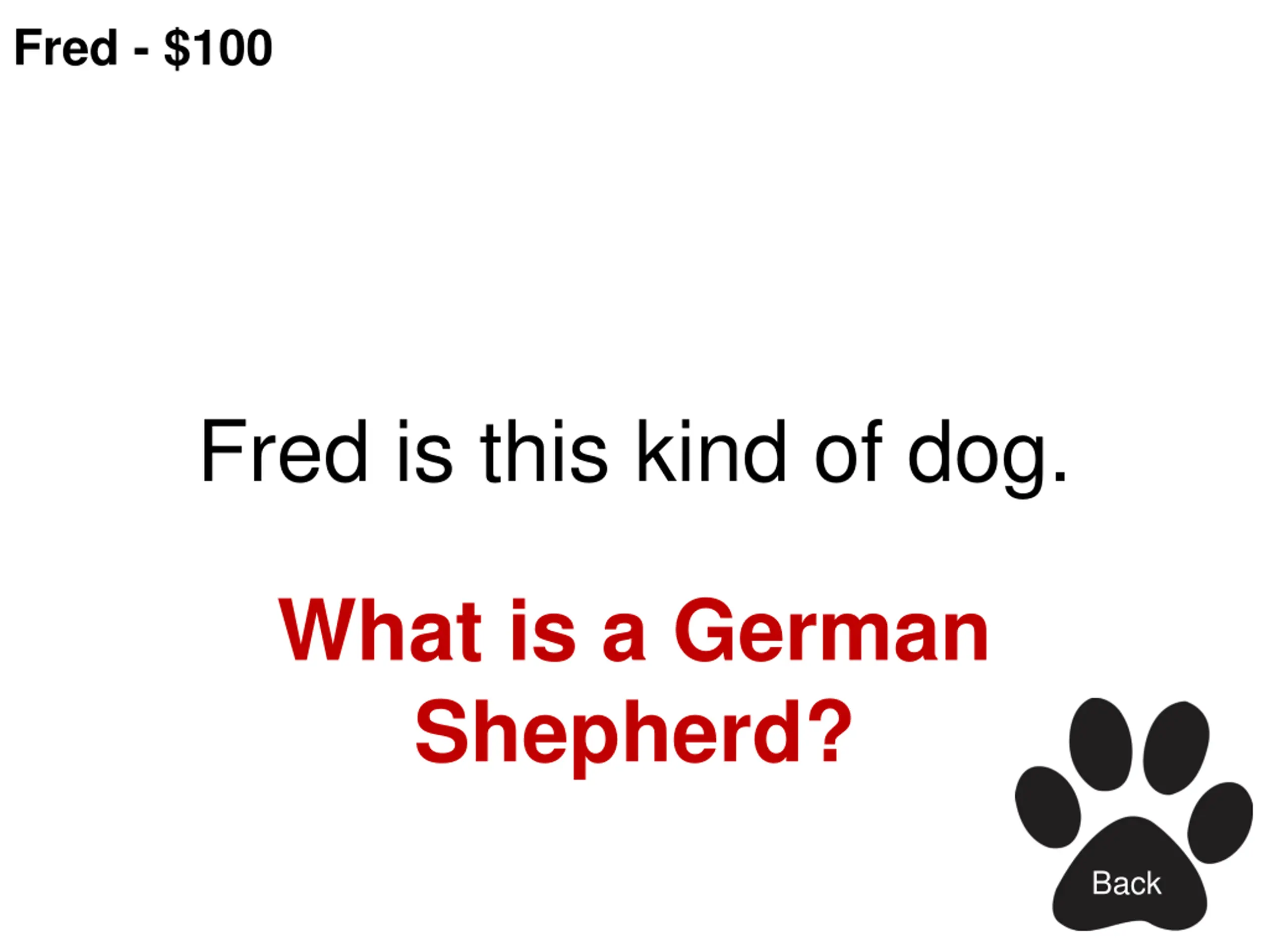 Fred - $100 Fred is this kind of dog. What is a German Shepherd? Back Back