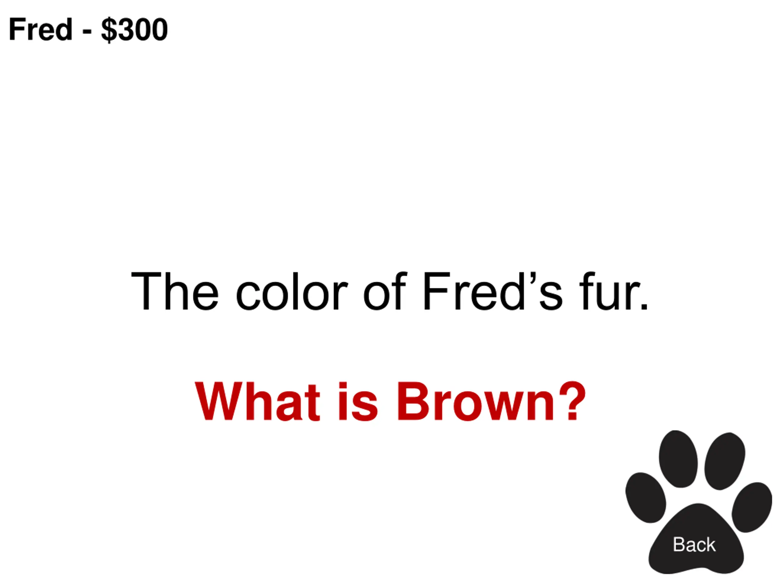 Fred - $300 The color of Fred s fur. What is Brown? Back Back