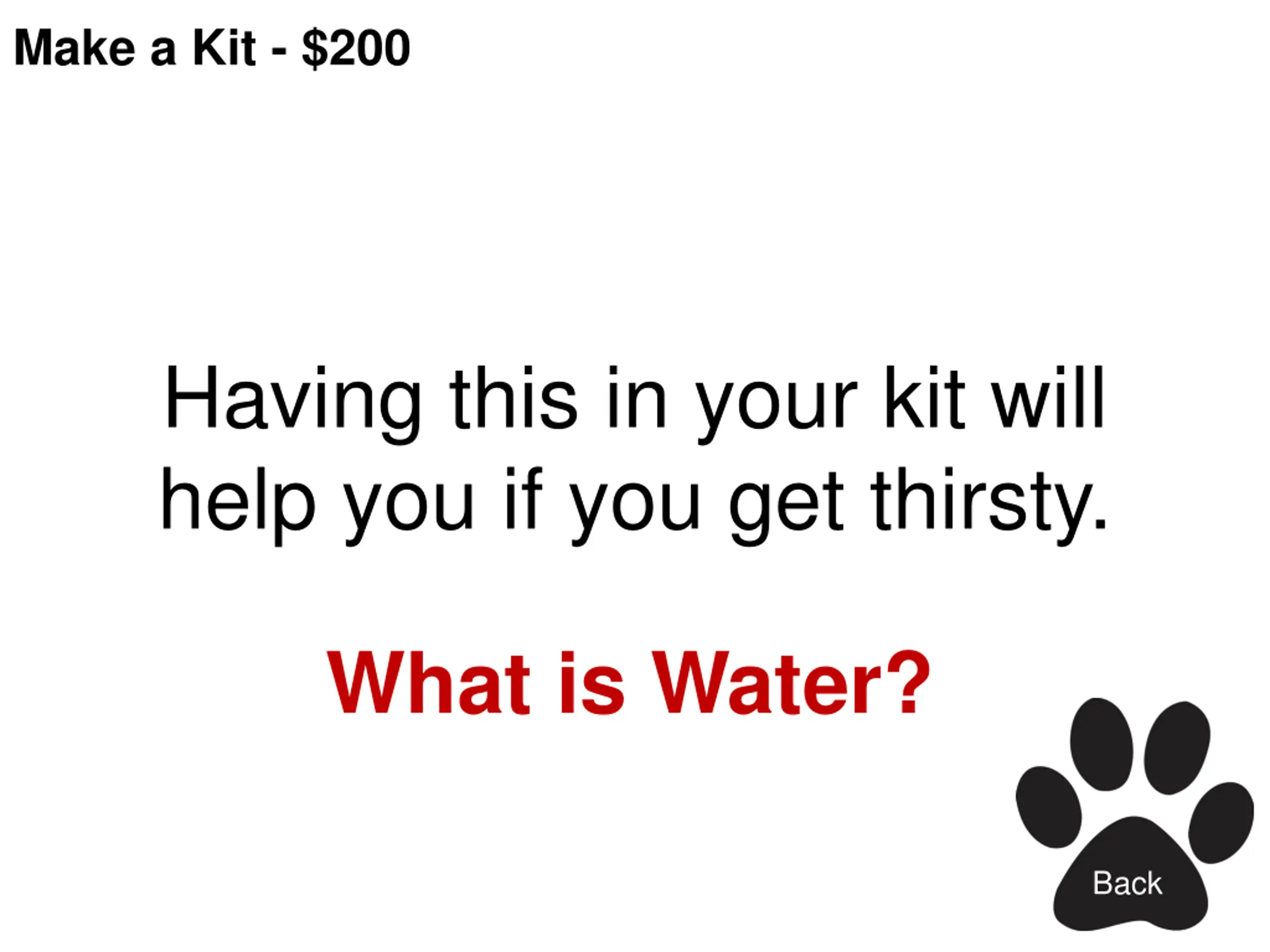 Make a Kit - $200 Having this in your kit will help you if you get thirsty. What is Water? Back