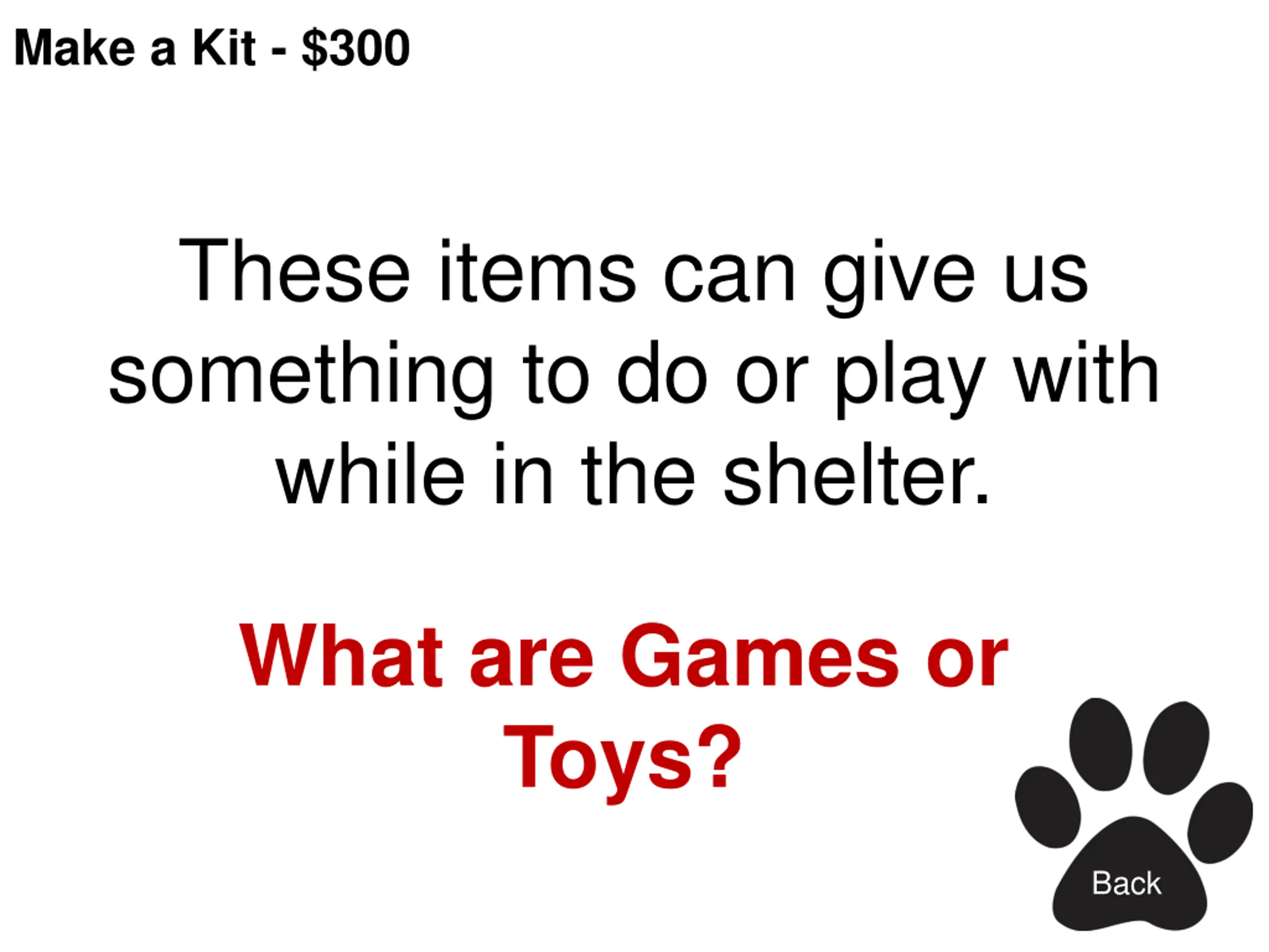 Make a Kit - $300 These items can give us something to do or play with while in the shelter. What are Games or Toys? Back