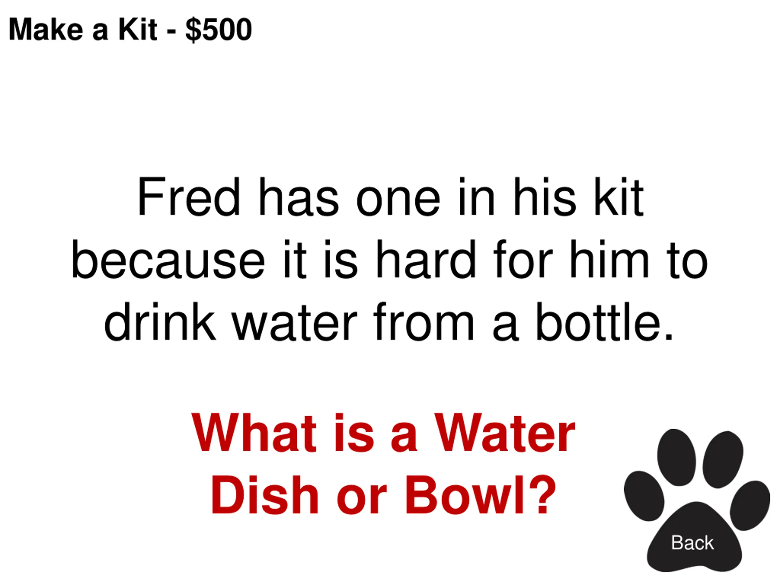 Make a Kit - $500 Fred has one in his kit because it is hard for him to drink water from a bottle. What is a Water Dish or Bowl? Back Back