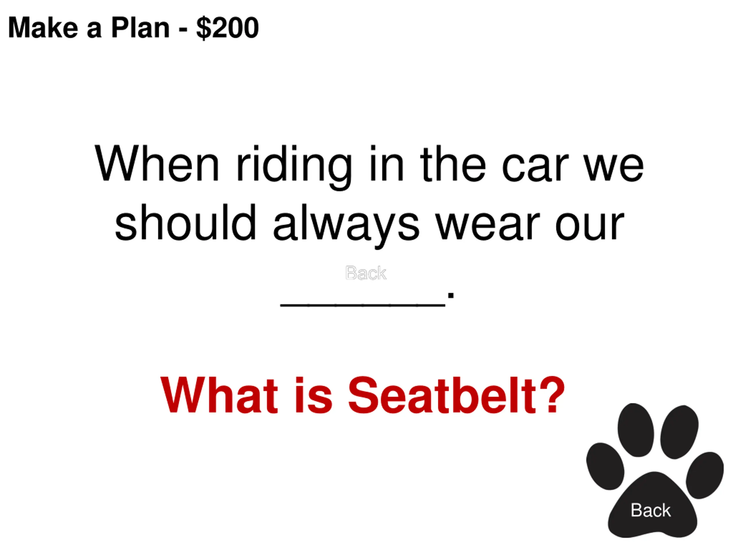 Make a Plan - $200 When riding in the car we should always wear our ______. What is Seatbelt? Back Back