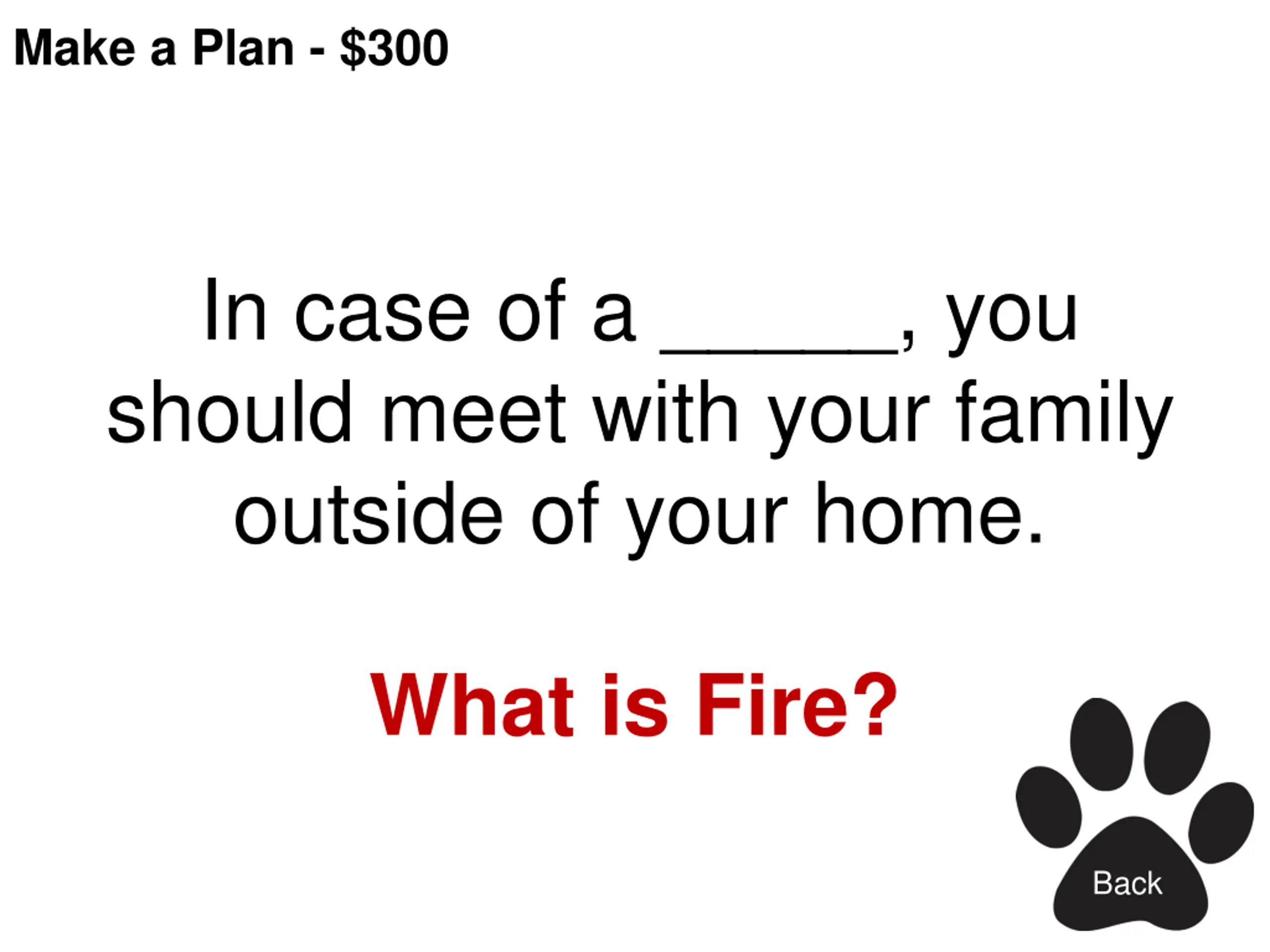 Make a Plan - $300 In case of a _____, you should meet with your family outside of your home. What is Fire? Back Back