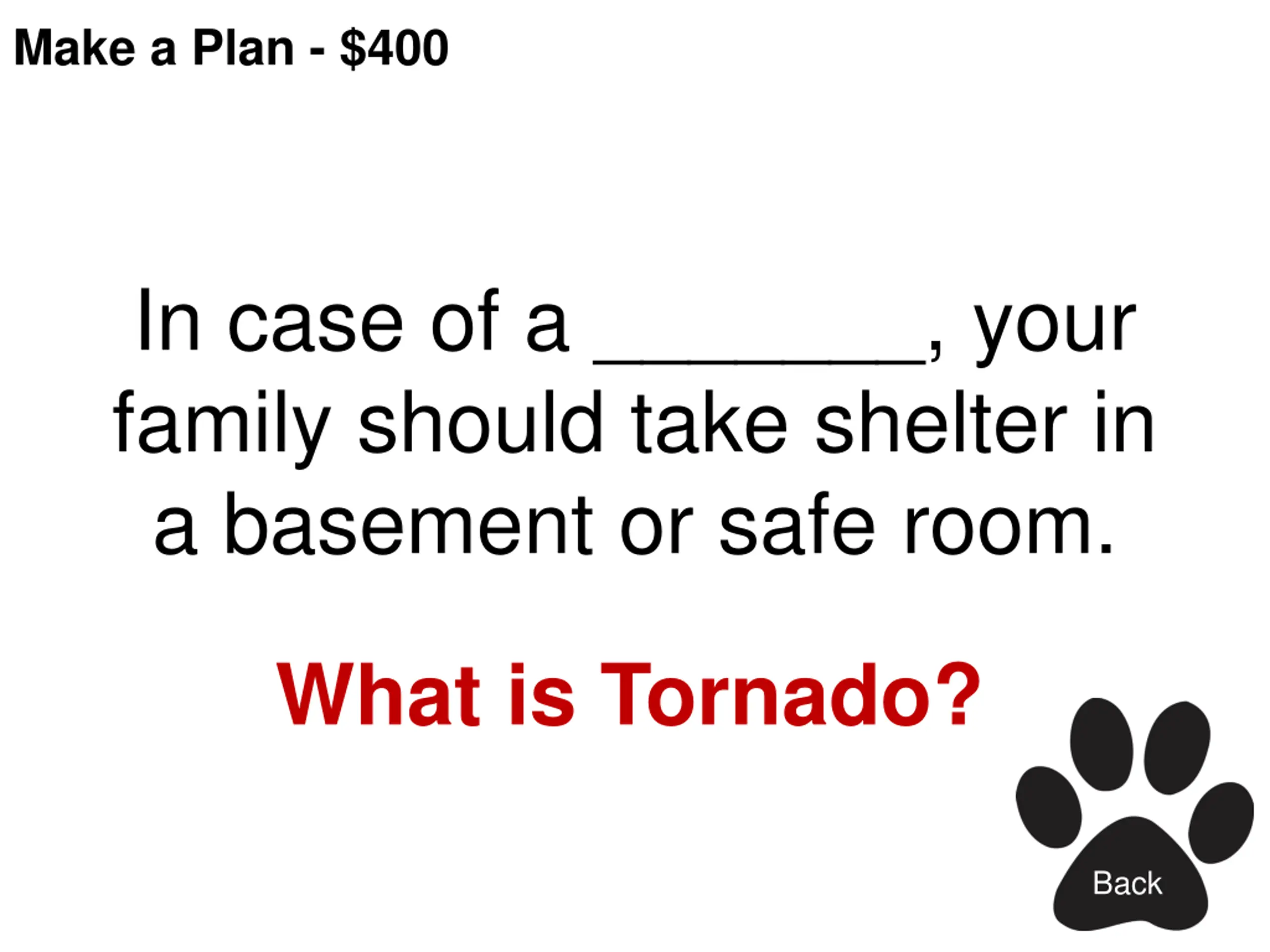 Make a Plan - $400 In case of a _______, your family should take shelter in a basement or safe room. What is Tornado? Back Back