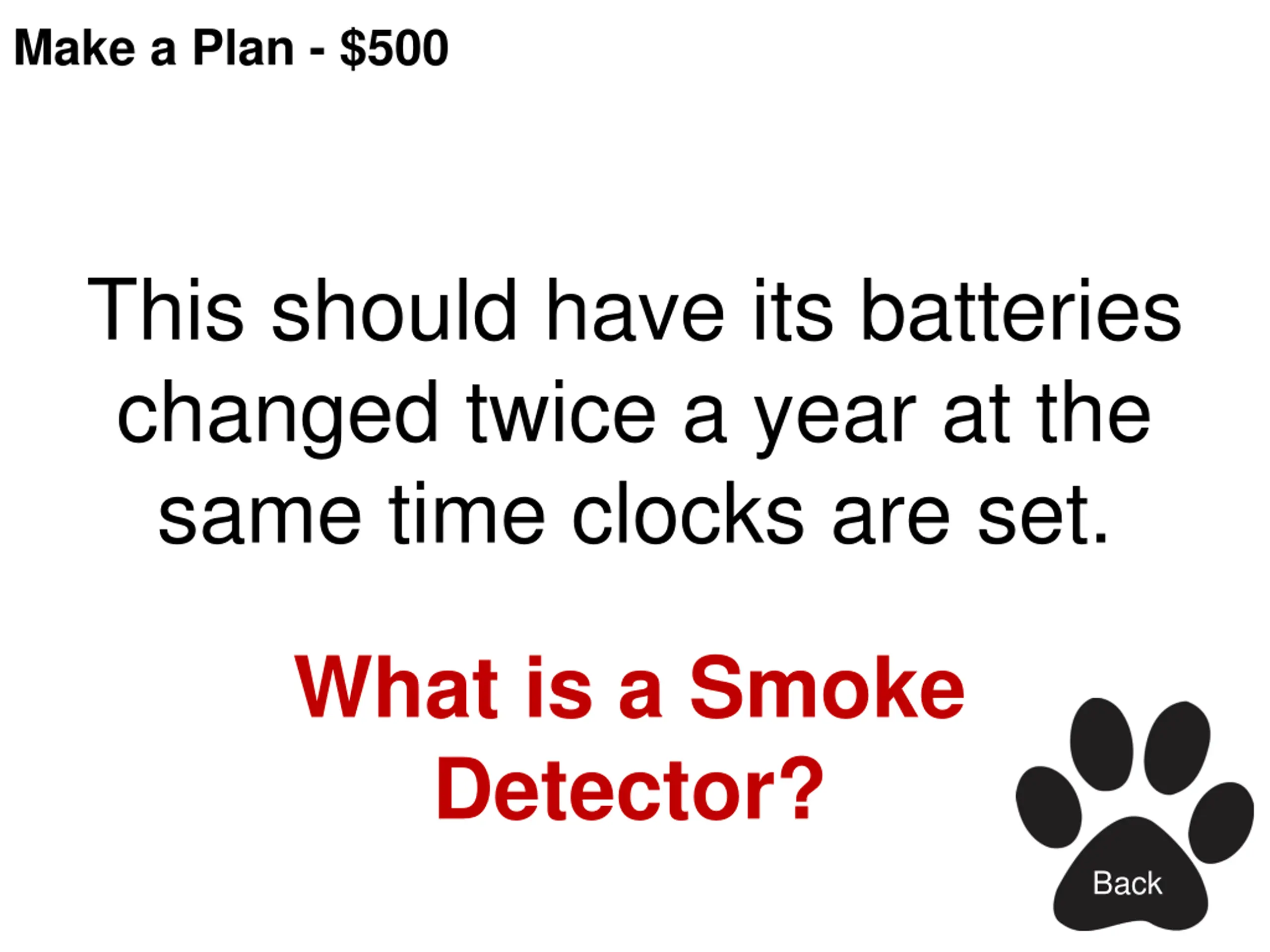 Make a Plan - $500 This should have its batteries changed twice a year at the same time clocks are set. What is a Smoke Detector? Back Back