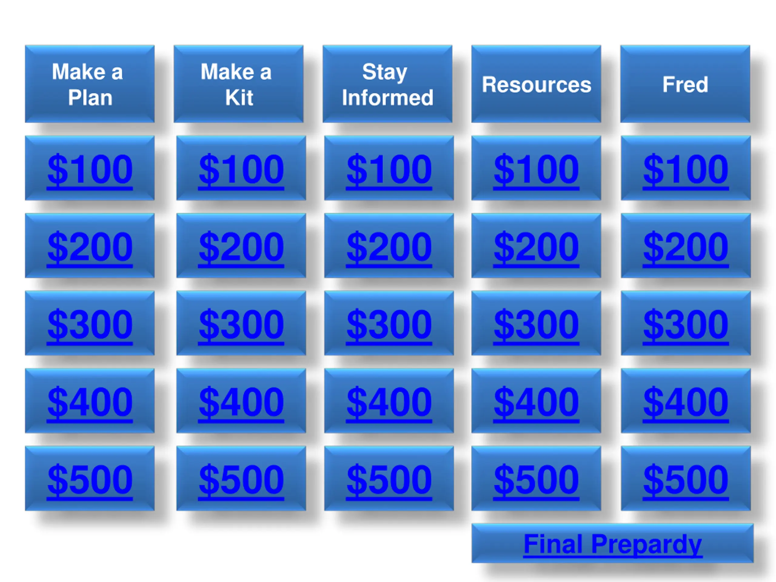 Make a Plan Make a Kit Stay Informed Resources Fred $100 $100 $100 $100 $100 $200 $200 $200 $200 $200 $300 $300 $300 $300 $300 $400 $400 $400 $400 $400 $500 $500 $500 $500 $500 Final Prepardy Final Prepardy