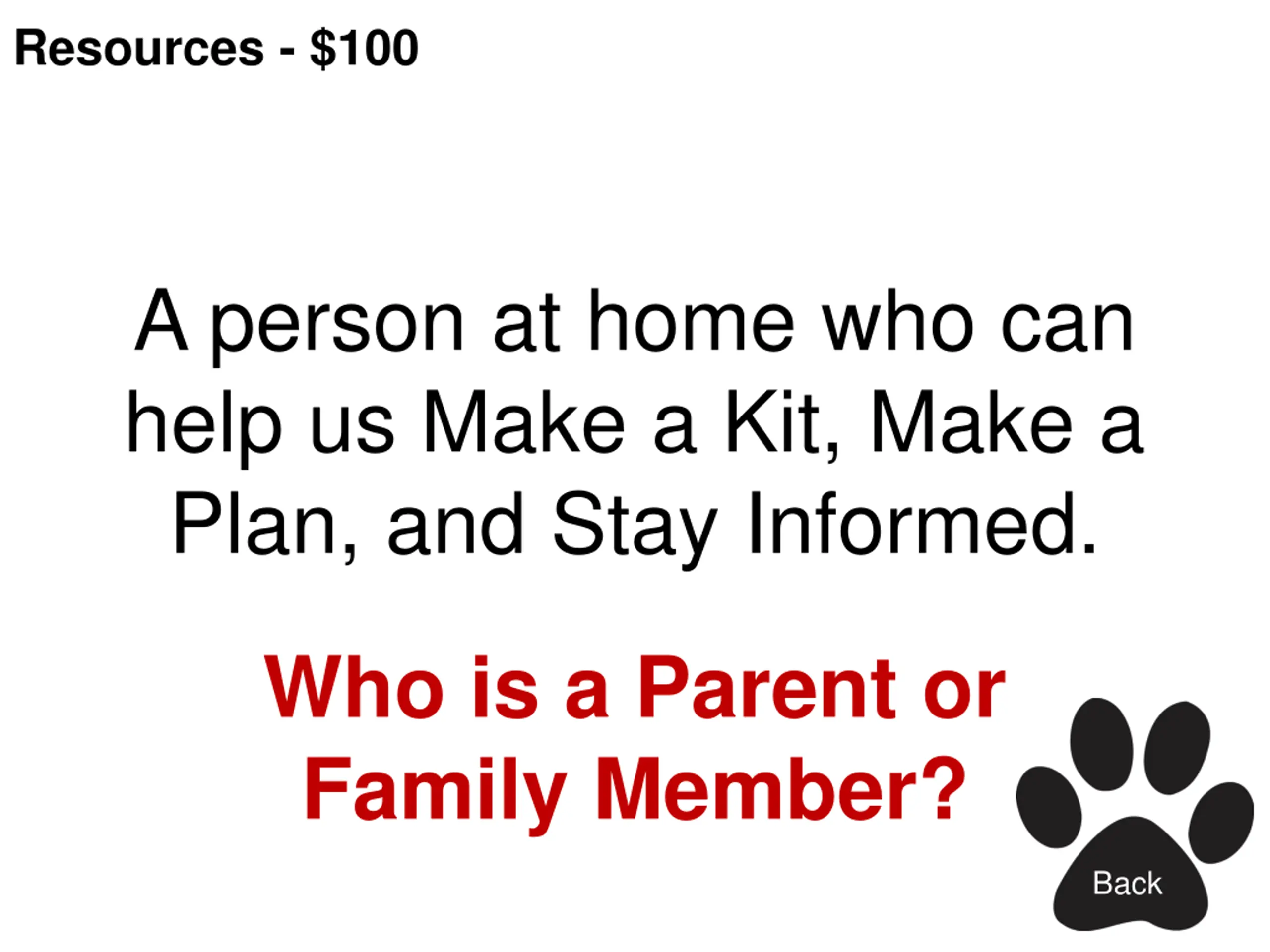 Resources - $100 A person at home who can help us Make a Kit, Make a Plan, and Stay Informed. Who is a Parent or Family Member? Back Back