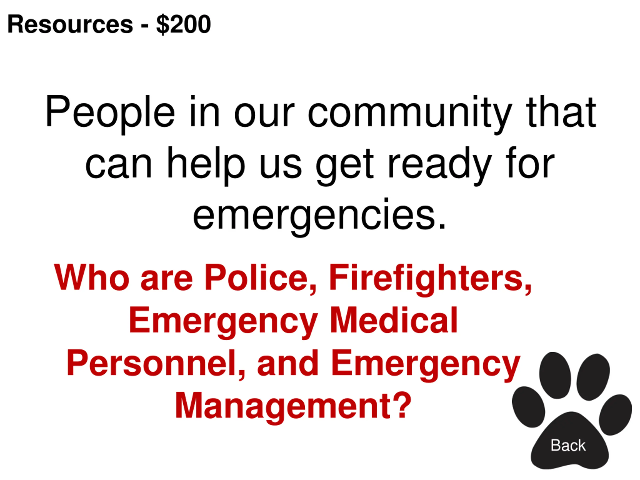 Resources - $200 People in our community that can help us get ready for emergencies. Who are Police, Firefighters, Emergency Medical Personnel, and Emergency Management? Back Back