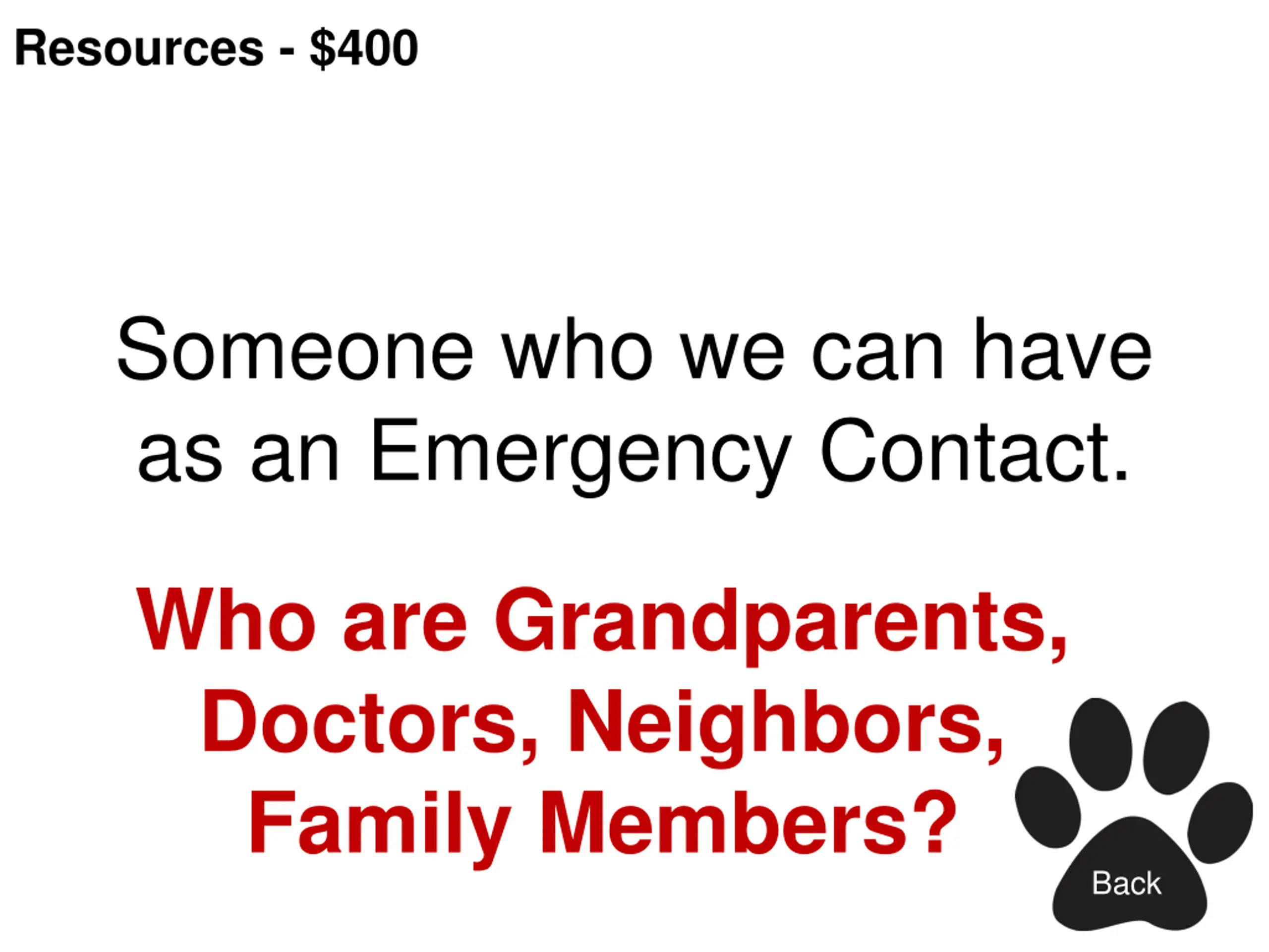 Resources - $400 Someone who we can have as an Emergency Contact. Who are Grandparents, Doctors, Neighbors, Family Members? Back Back
