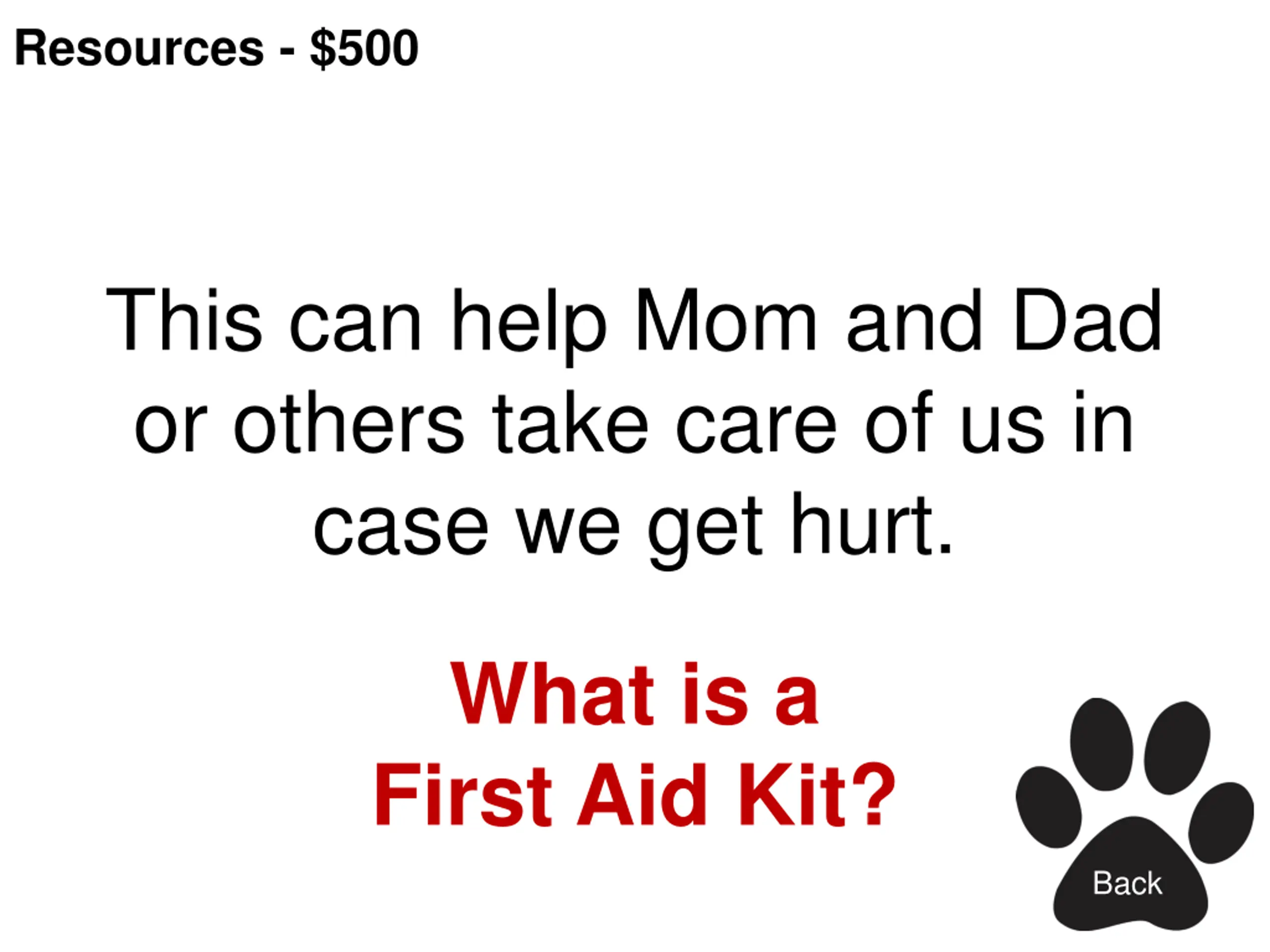 Resources - $500 This can help Mom and Dad or others take care of us in case we get hurt. What is a First Aid Kit? Back Back