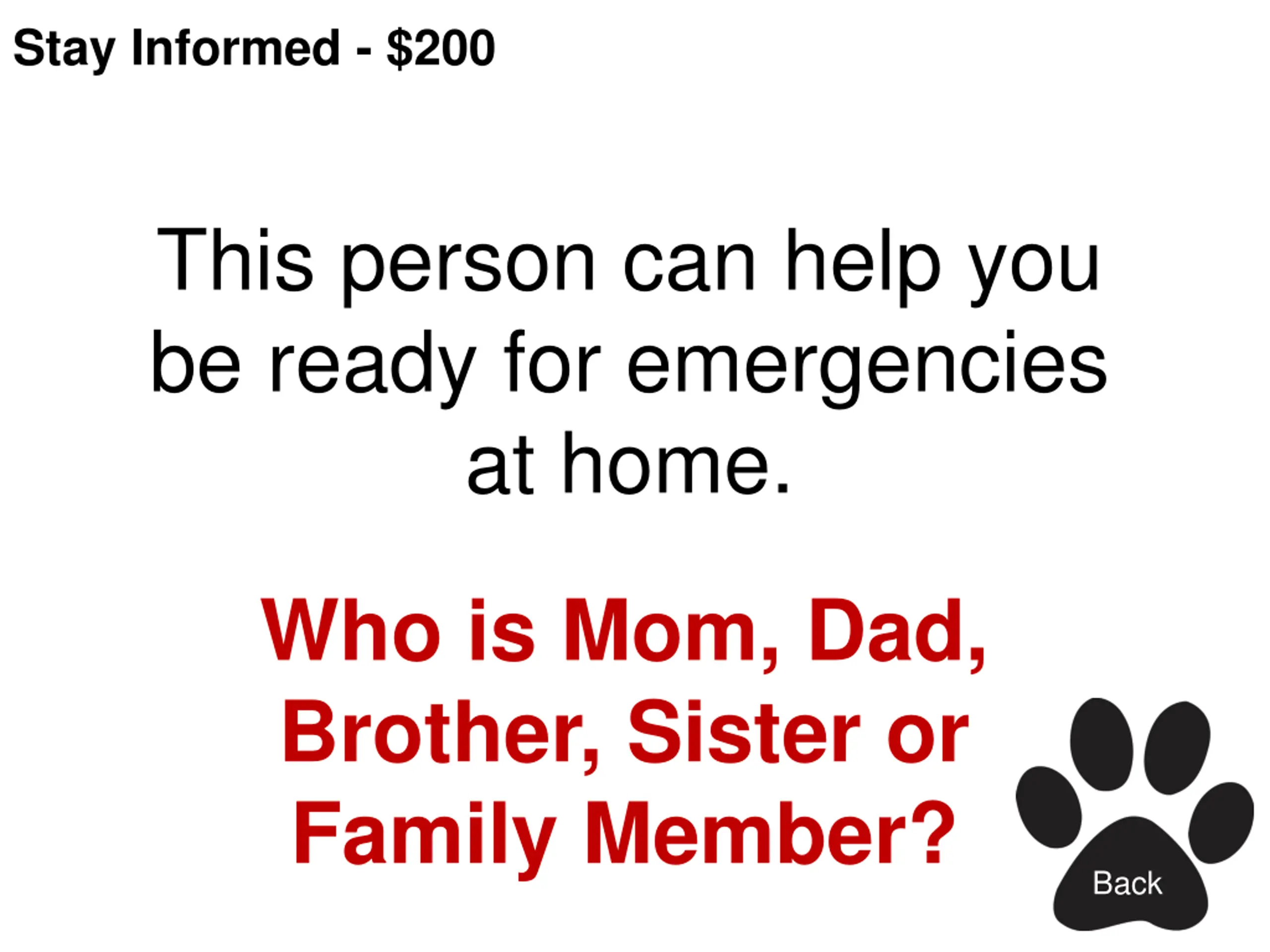 Stay Informed - $200 This person can help you be ready for emergencies at home. Who is Mom, Dad, Brother, Sister or Family Member? Back Back