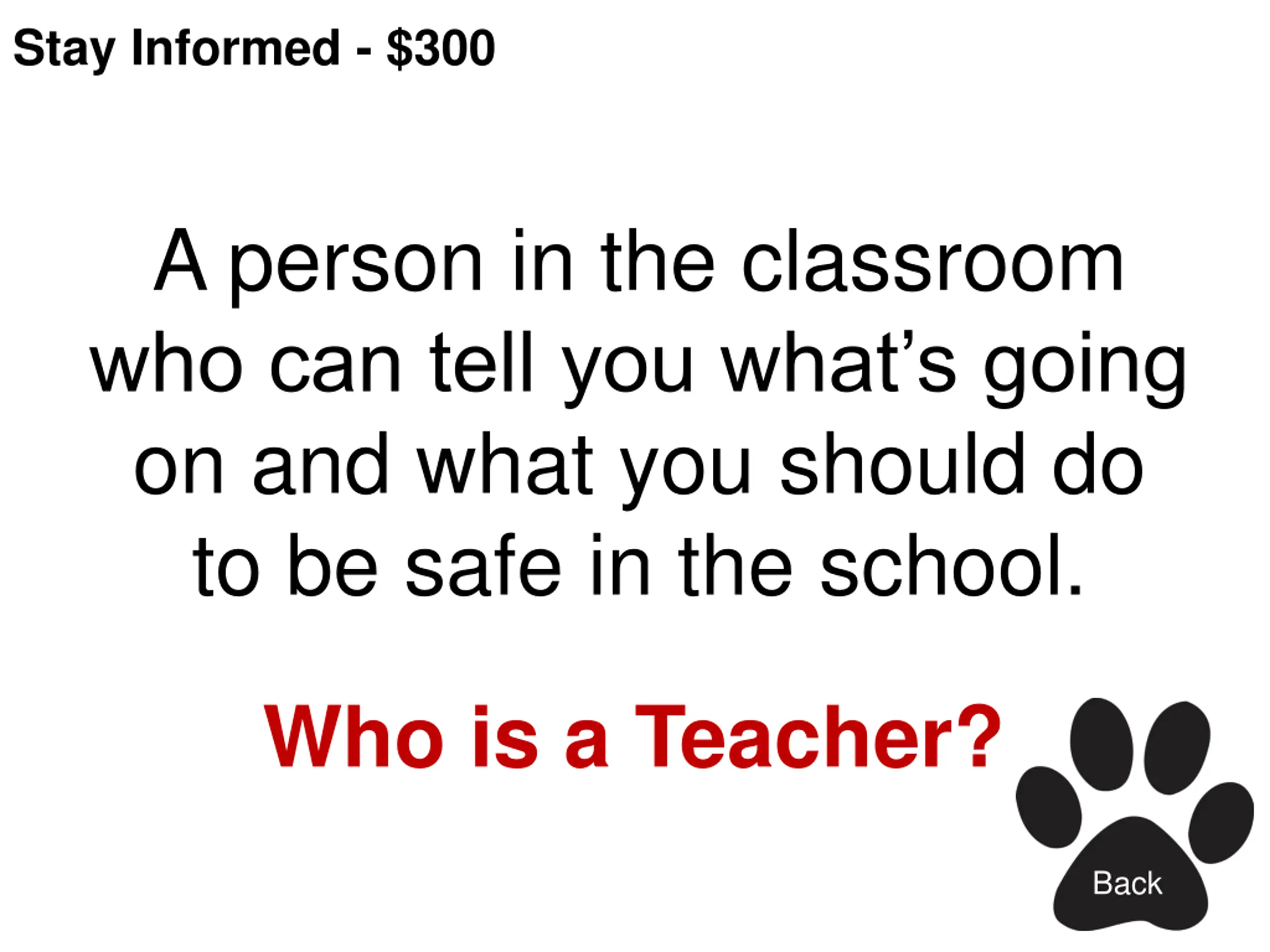 Stay Informed - $300 A person in the classroom who can tell you what s going on and what you should do to be safe in the school. Who is a Teacher? Back Back