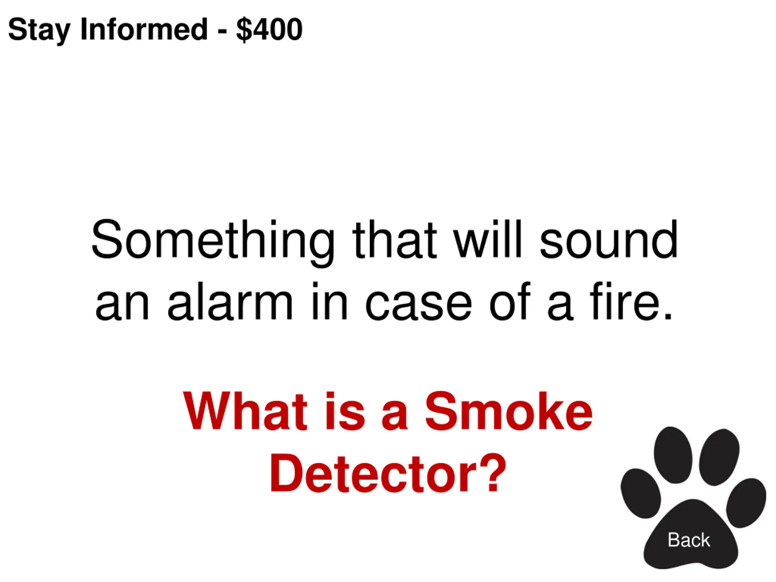 Stay Informed - $400 Something that will sound an alarm in case of a fire. What is a Smoke Detector? Back Back