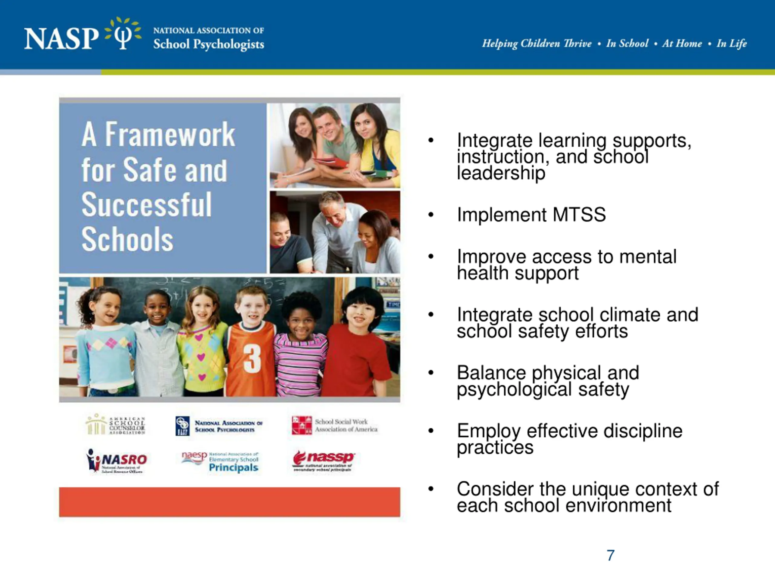 Integrate learning supports, instruction, and school leadership Implement MTSS Improve access to mental health support Integrate school climate and school safety efforts Balance physical and psychological safety Employ effective discipline practices Consider the unique context of each school environment 7