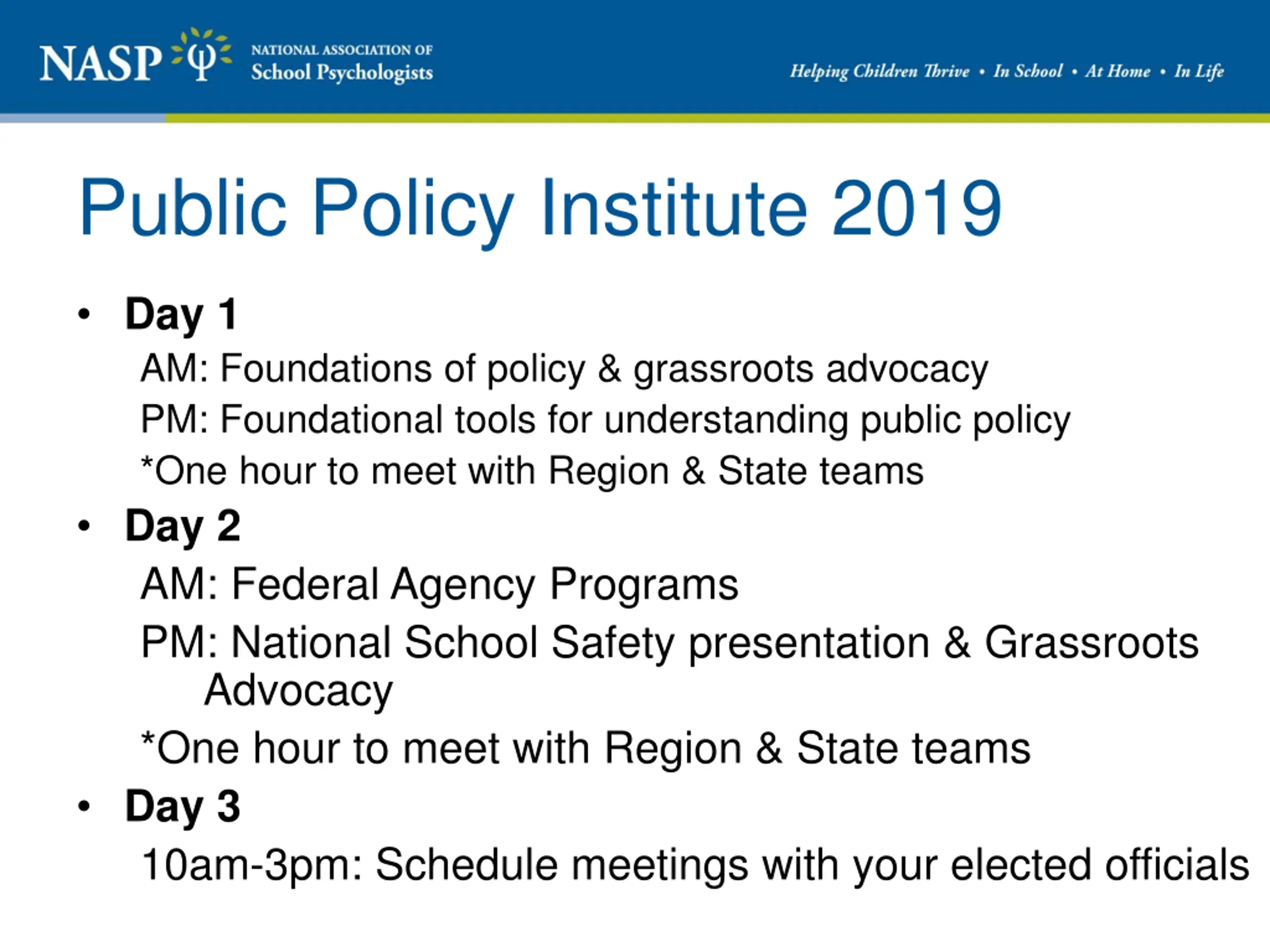 Public Policy Institute 2019 Day 1 AM: Foundations of policy & grassroots advocacy PM: Foundational tools for understanding public policy *One hour to meet with Region & State teams Day 2 AM: Federal Agency Programs PM: National School Safety presentation & Grassroots Advocacy *One hour to meet with Region & State teams Day 3 10am-3pm: Schedule meetings with your elected officials
