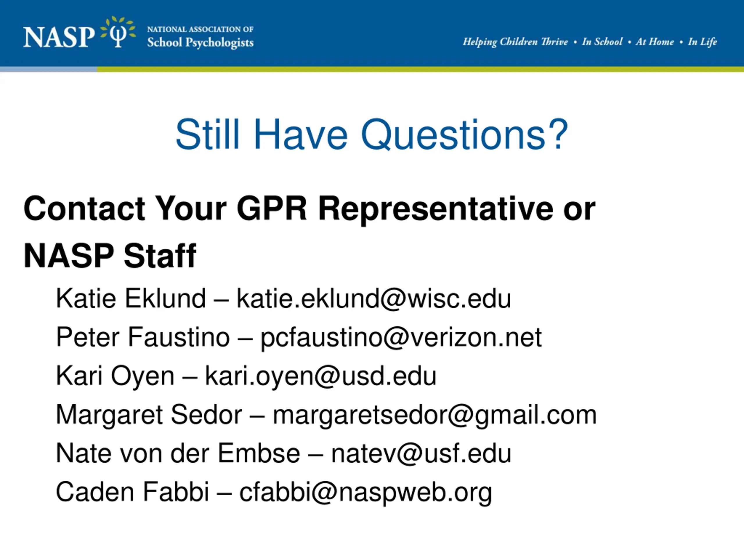 Still Have Questions? Contact Your GPR Representative or NASP Staff Katie Eklund katie.eklund@wisc.edu Peter Faustino pcfaustino@verizon.net Kari Oyen kari.oyen@usd.edu Margaret Sedor margaretsedor@gmail.com Nate von der Embse natev@usf.edu Caden Fabbi cfabbi@naspweb.org