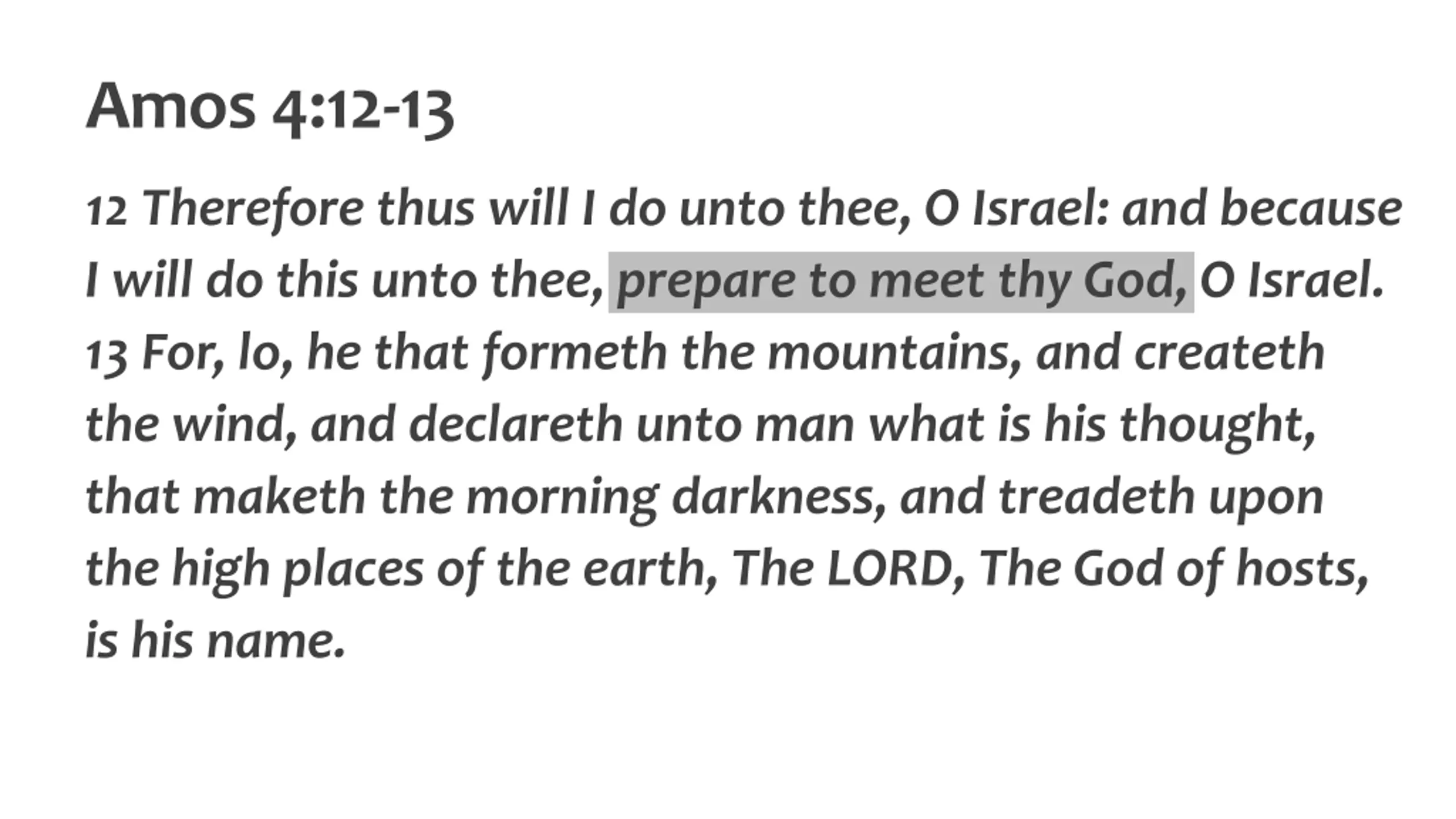 Amos 4:12-13 12 Therefore thus will I do unto thee, O Israel: and because I will do this unto thee, prepare to meet thy God, O Israel. 13 For, lo, he that formeth the mountains, and createth the wind, and declareth unto man what is his thought, that maketh the morning darkness, and treadeth upon the high places of the earth, The LORD, The God of hosts, is his name.