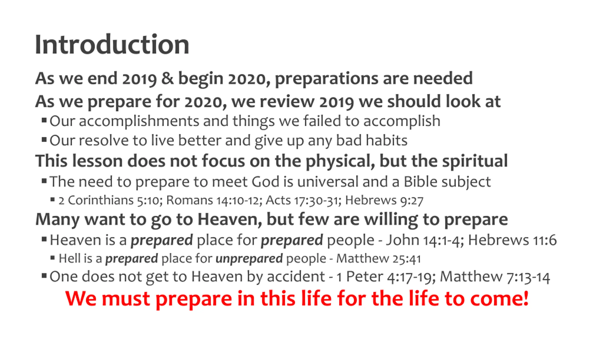 Introduction As we end 2019 & begin 2020, preparations are needed As we prepare for 2020, we review 2019 we should look at Our accomplishments and things we failed to accomplish Our resolve to live better and give up any bad habits This lesson does not focus on the physical, but the spiritual The need to prepare to meet God is universal and a Bible subject 2 Corinthians 5:10; Romans 14:10-12; Acts 17:30-31; Hebrews 9:27 Many want to go to Heaven, but few are willing to prepare Heaven is a prepared place for prepared people - John 14:1-4; Hebrews 11:6 Hell is a prepared place for unprepared people - Matthew 25:41 One does not get to Heaven by accident - 1 Peter 4:17-19; Matthew 7:13-14 We must prepare in this life for the life to come!