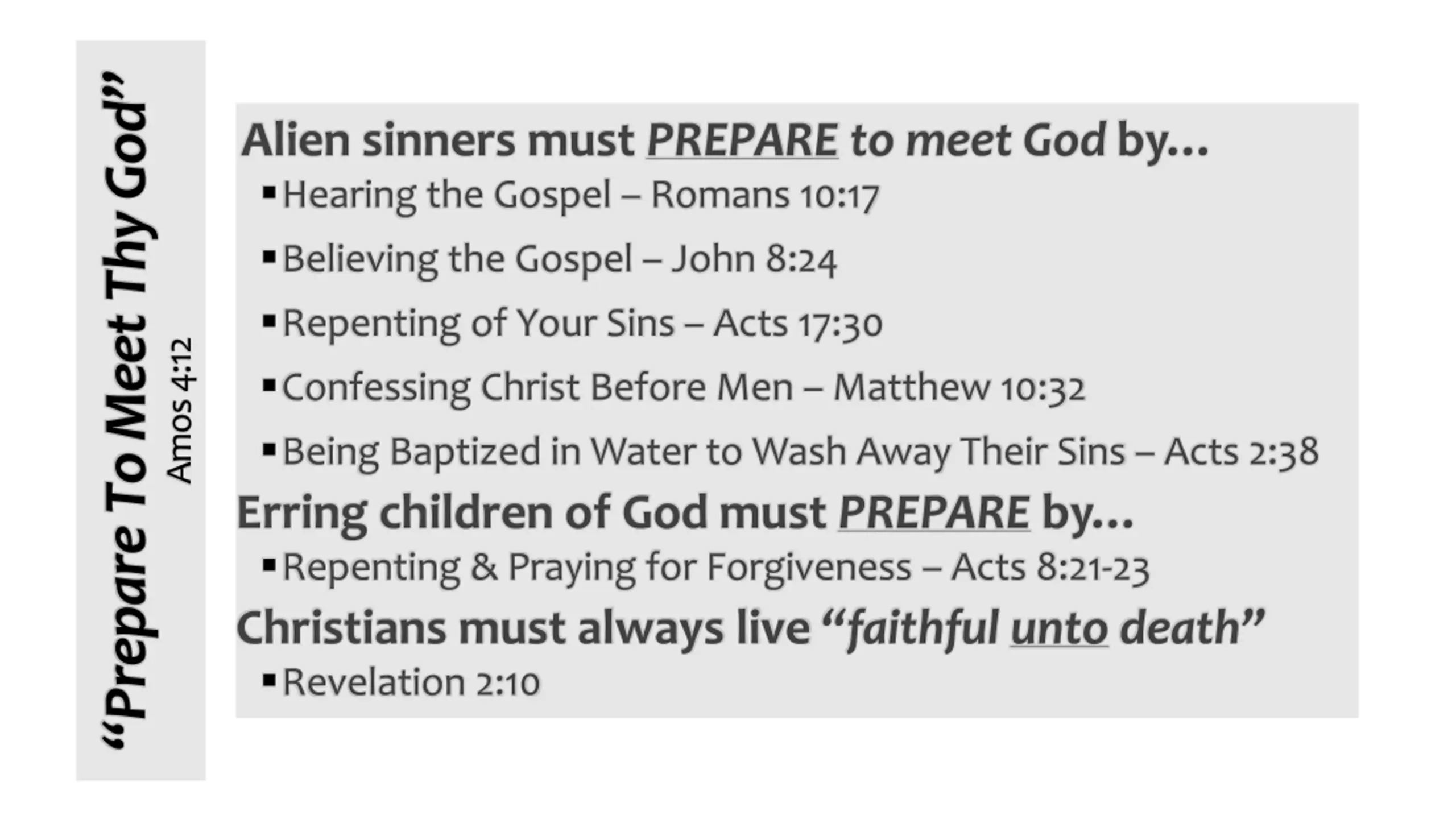 Prepare To Meet Thy God Alien sinners must PREPARE to meet Godby Hearing the Gospel Romans 10:17 Believing the Gospel John 8:24 Repenting of Your Sins Acts 17:30 Confessing Christ Before Men Matthew 10:32 Being Baptized in Water to Wash Away Their Sins Acts 2:38 Erring children of God must PREPAREby Repenting & Praying for Forgiveness Acts 8:21-23 Christians must always live faithful unto death Revelation 2:10 Amos 4:12 12