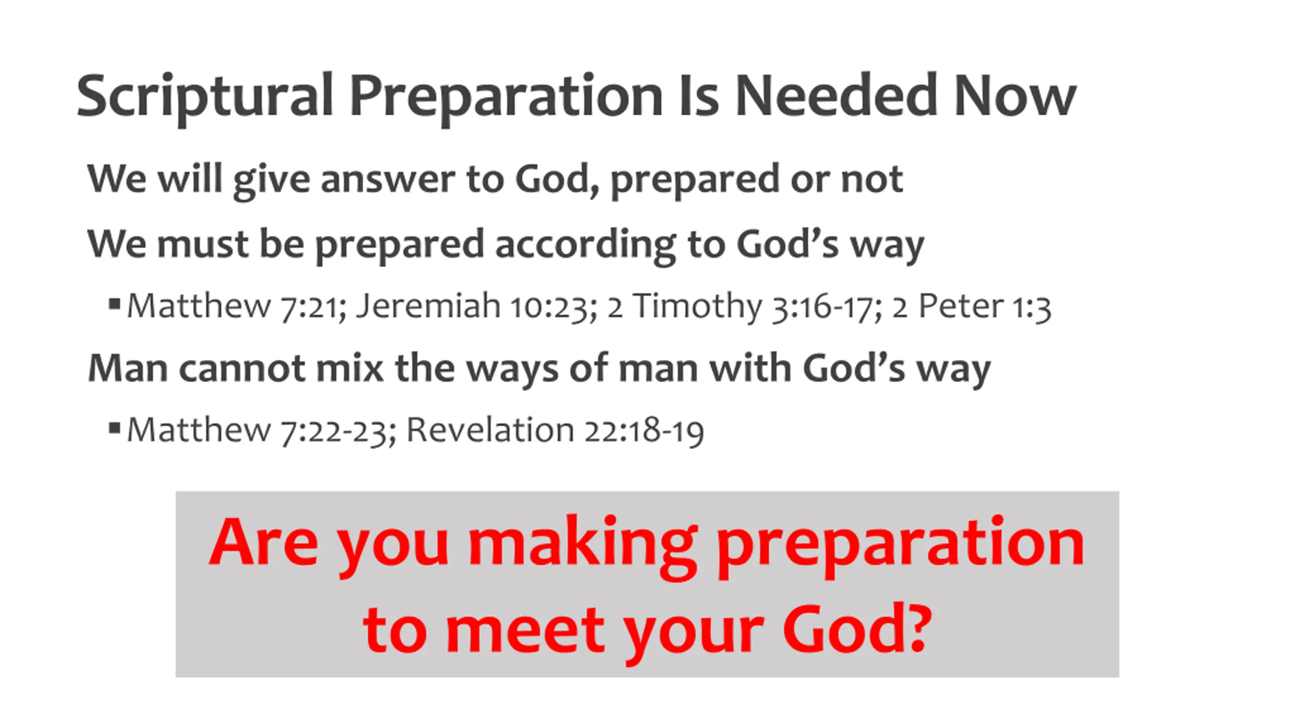 Scriptural Preparation Is Needed Now We will give answer to God, prepared or not We must be prepared according to God s way Matthew 7:21; Jeremiah 10:23; 2 Timothy 3:16-17; 2 Peter 1:3 Man cannot mix the ways of man with God s way Matthew 7:22-23; Revelation 22:18-19 Are you making preparation to meet your God?
