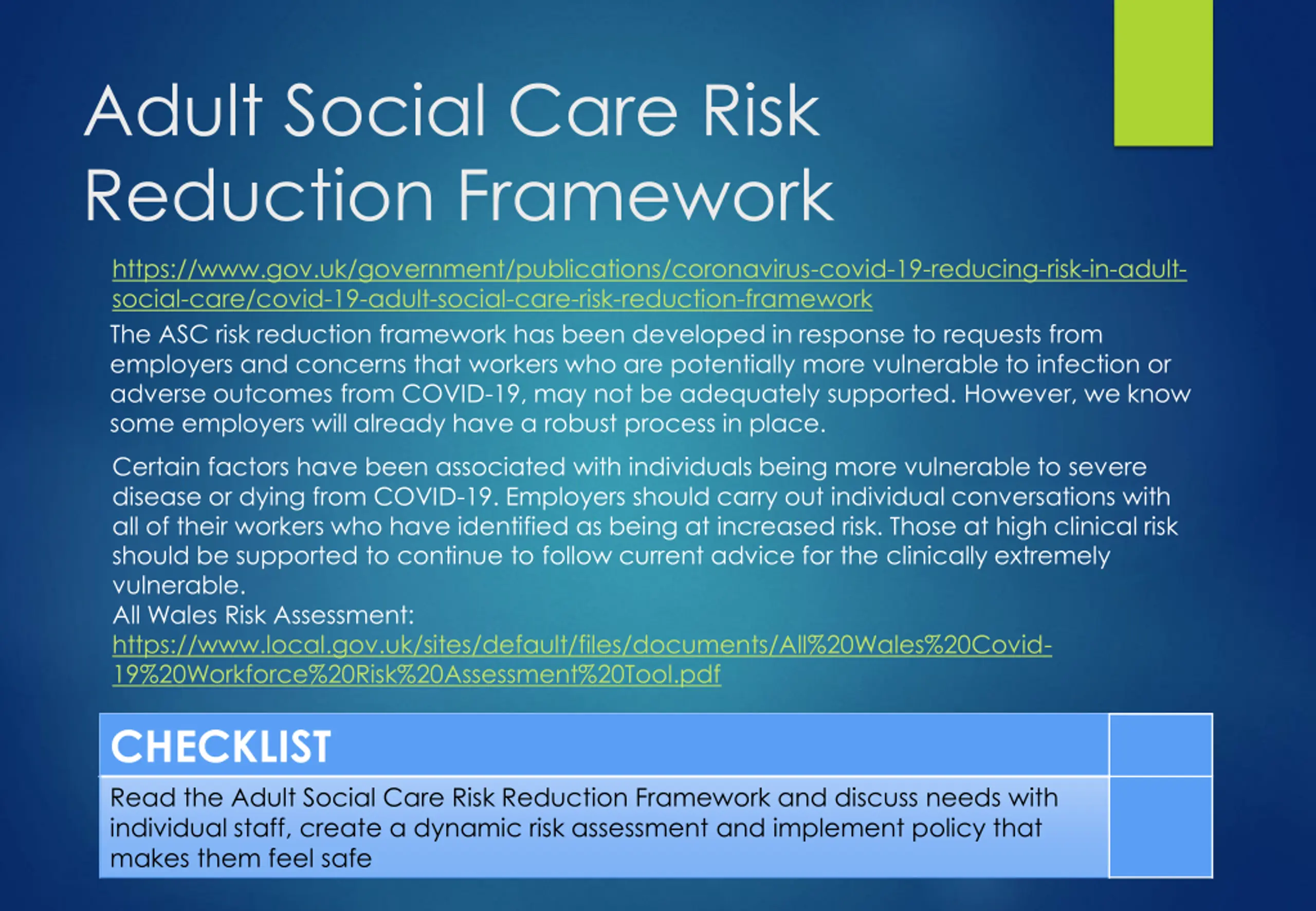 Adult Social Care Risk Reduction Framework https://www.gov.uk/government/publications/coronavirus-covid-19-reducing-risk-in-adult- social-care/covid-19-adult-social-care-risk-reduction-framework The ASC risk reduction framework has been developed in response to requests from employers and concerns that workers who are potentially more vulnerable to infection or adverse outcomes from COVID-19, may not be adequately supported. However, we know some employers will already have a robust process in place. Certain factors have been associated with individuals being more vulnerable to severe disease or dying from COVID-19. Employers should carry out individual conversations with all of their workers who have identified as being at increased risk. Those at high clinical risk should be supported to continue to follow current advice for the clinically extremely vulnerable. All Wales Risk Assessment: https://www.local.gov.uk/sites/default/files/documents/All%20Wales%20Covid- 19%20Workforce%20Risk%20Assessment%20Tool.pdf CHECKLIST Read the Adult Social Care Risk Reduction Framework and discuss needs with individual staff, create a dynamic risk assessment and implement policy that makes them feel safe