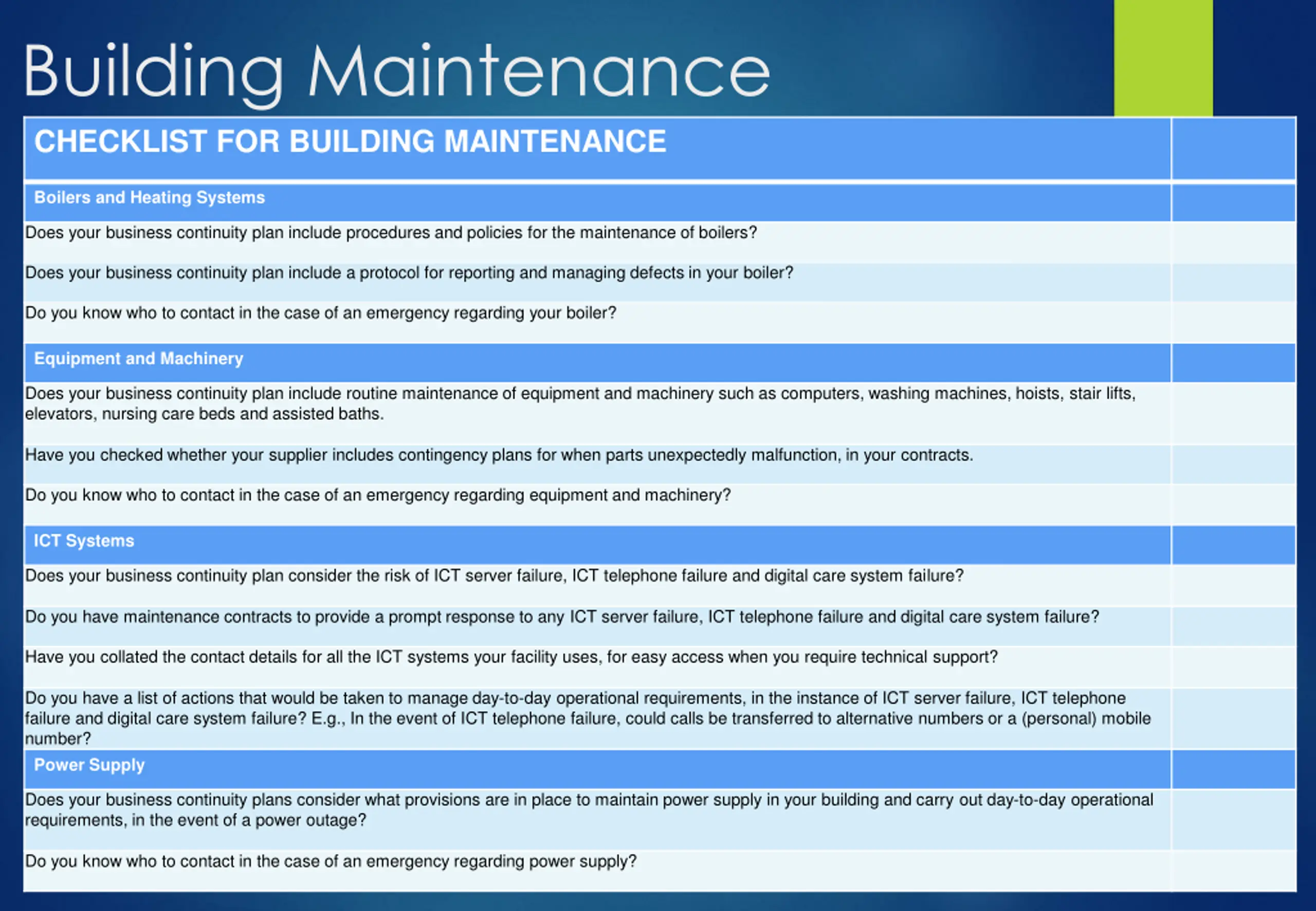 Building Maintenance Your Business Continuity Plan should include building maintenance procedures to ensure the following have been checked or serviced. If you experience problems with any items on this checklist, please inform The Commissioning Team and CQC. Print out contact numbers so staff know who to call in the event of a failure. CHECKLIST FOR BUILDING MAINTENANCE Boilers and Heating systems Equipment and Machinery ICT services Power supply