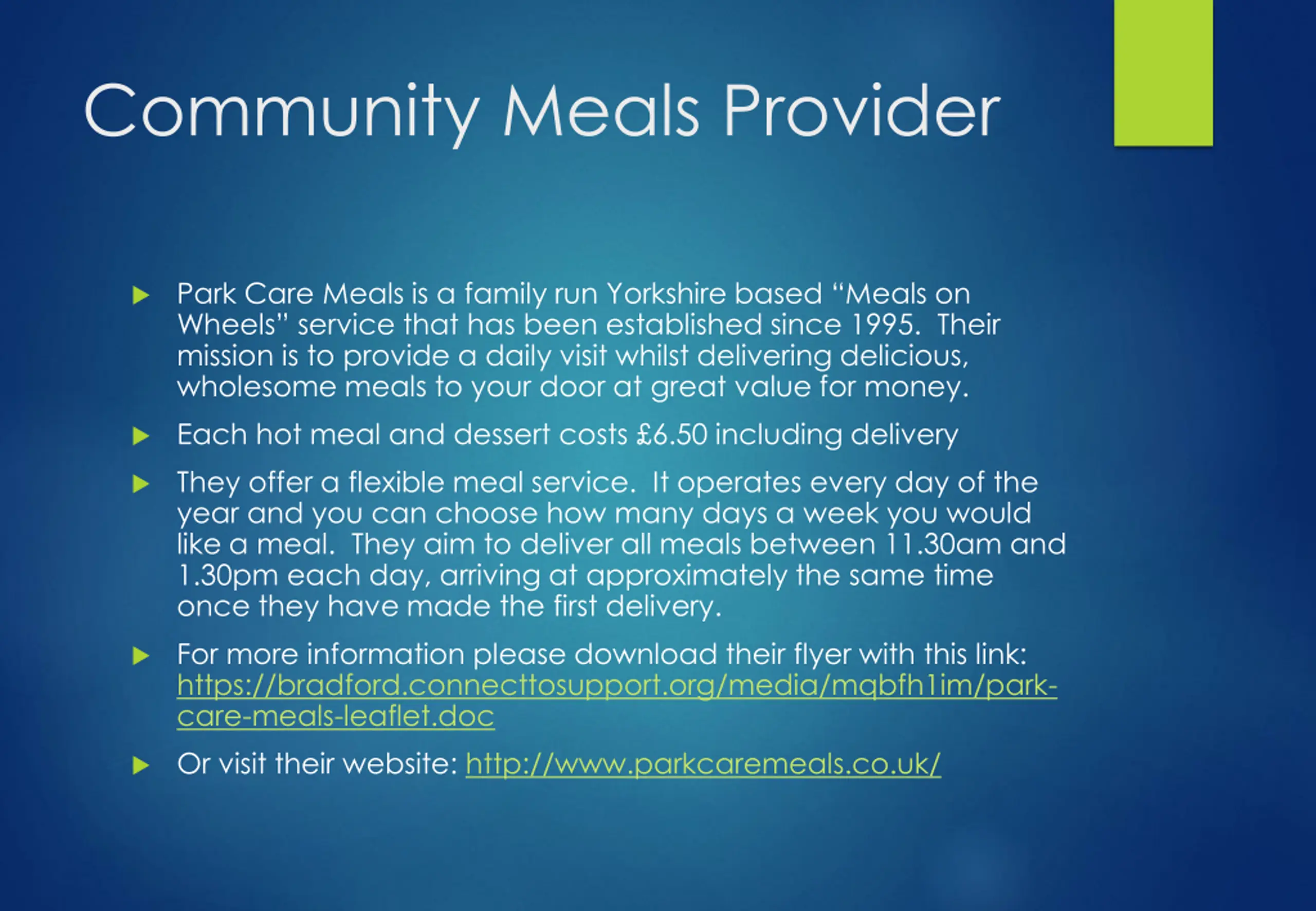 Community Meals Provider Park Care Meals is a family run Yorkshire based Meals on Wheels service that has been established since 1995. Their mission is to provide a daily visit whilst delivering delicious, wholesome meals to your door at great value for money. Each hot meal and dessert costs 6.50 including delivery They offer a flexible meal service. It operates every day of the year and you can choose how many days a week you would like a meal. They aim to deliver all meals between 11.30am and 1.30pm each day, arriving at approximately the same time once they have made the first delivery. For more information please download their flyer with this link: https://bradford.connecttosupport.org/media/mqbfh1im/park- care-meals-leaflet.doc Or visit their website: http://www.parkcaremeals.co.uk/