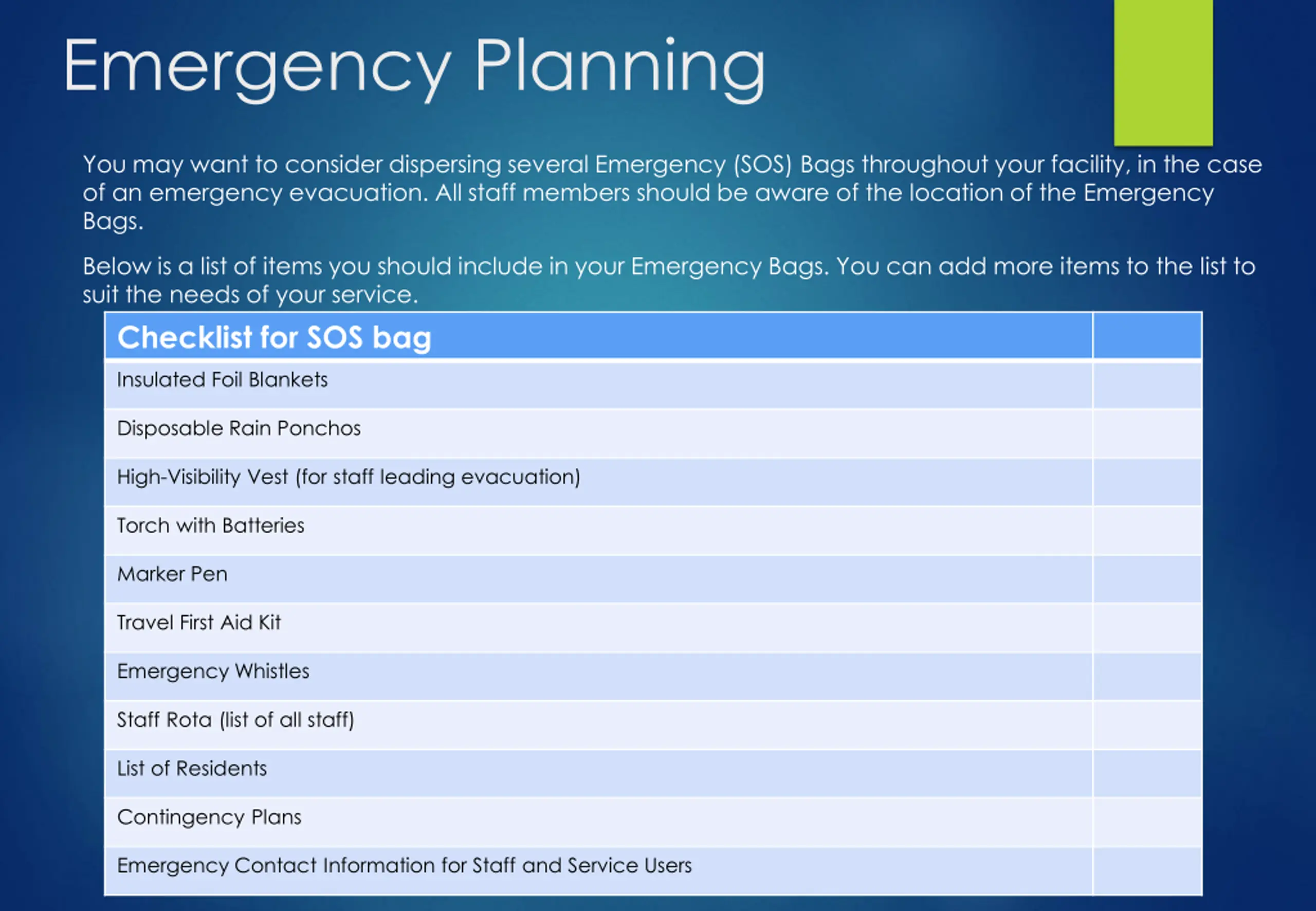 Emergency Planning You may want to consider dispersing several Emergency (SOS) Bags throughout your facility, in the case of an emergency evacuation. All staff members should be aware of the location of the Emergency Bags. Below is a list of items you should include in your Emergency Bags. You can add more items to the list to suit the needs of your service. Checklist for SOS bag Insulated Foil Blankets Disposable Rain Ponchos High-Visibility Vest (for staff leading evacuation) Torch with Batteries Marker Pen Travel First Aid Kit Emergency Whistles Staff Rota (list of all staff) List of Residents Contingency Plans Emergency Contact Information for Staff and Service Users