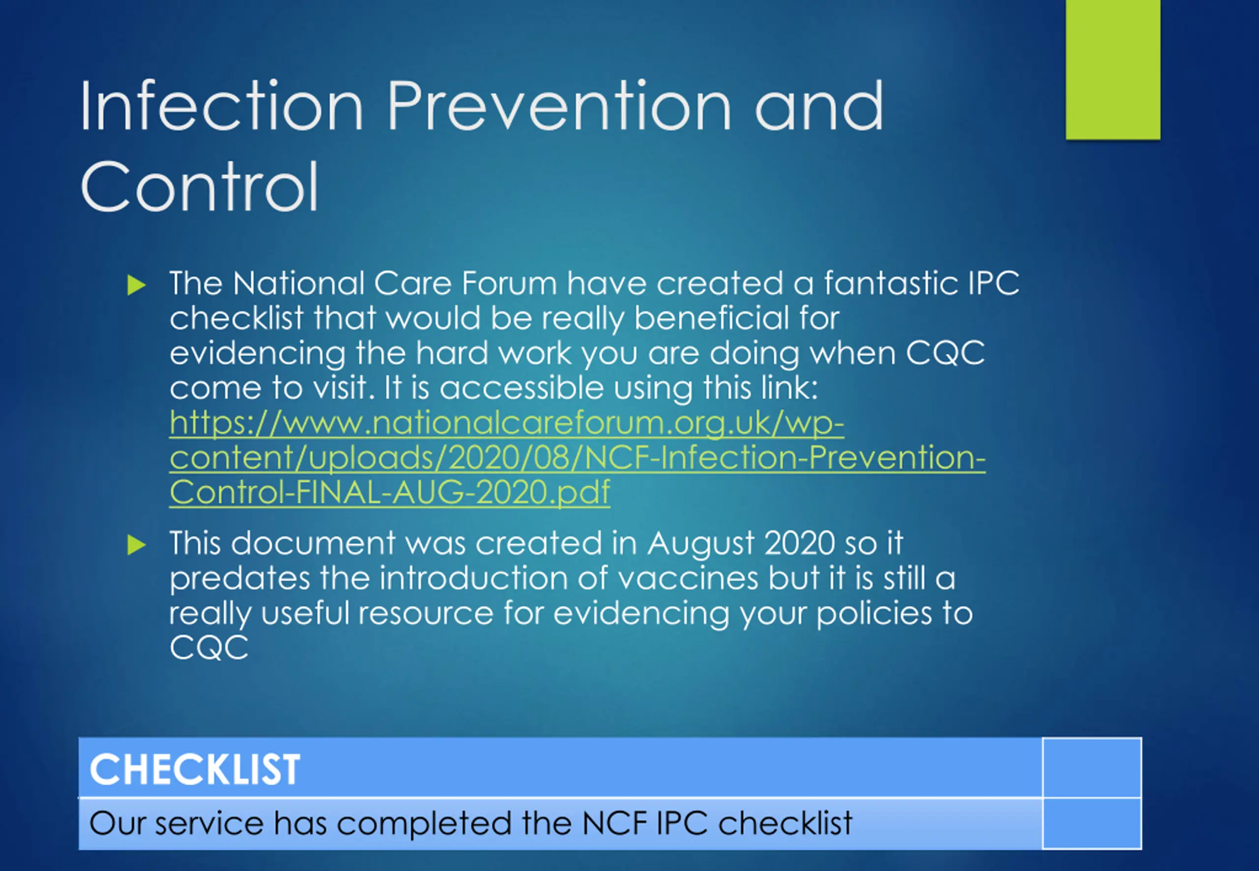 Infection Prevention and Control The National Care Forum have created a fantastic IPC checklist that would be really beneficial for evidencing the hard work you are doing when CQC come to visit. It is accessible using this link: https://www.nationalcareforum.org.uk/wp- content/uploads/2020/08/NCF-Infection-Prevention- Control-FINAL-AUG-2020.pdf This document was created in August 2020 so it predates the introduction of vaccines but it is still a really useful resource for evidencing your policies to CQC CHECKLIST Our service has completed the NCF IPC checklist