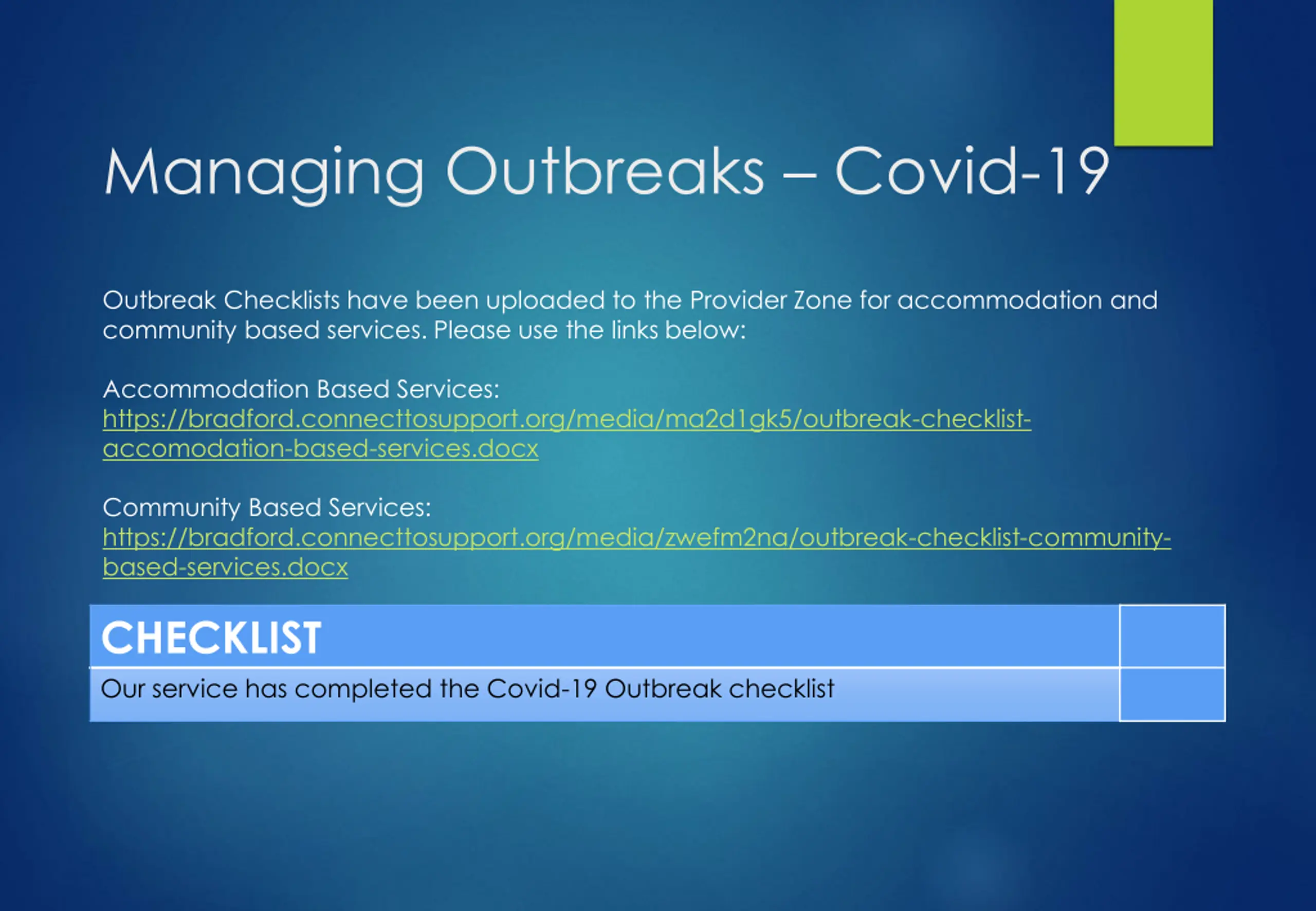 Managing Outbreaks Covid-19 Outbreak Checklists have been uploaded to the Provider Zone for accommodation and community based services. Please use the links below: Accommodation Based Services: https://bradford.connecttosupport.org/media/ma2d1gk5/outbreak-checklist- accomodation-based-services.docx Community Based Services: https://bradford.connecttosupport.org/media/zwefm2na/outbreak-checklist-community- based-services.docx CHECKLIST Our service has completed the Covid-19 Outbreak checklist
