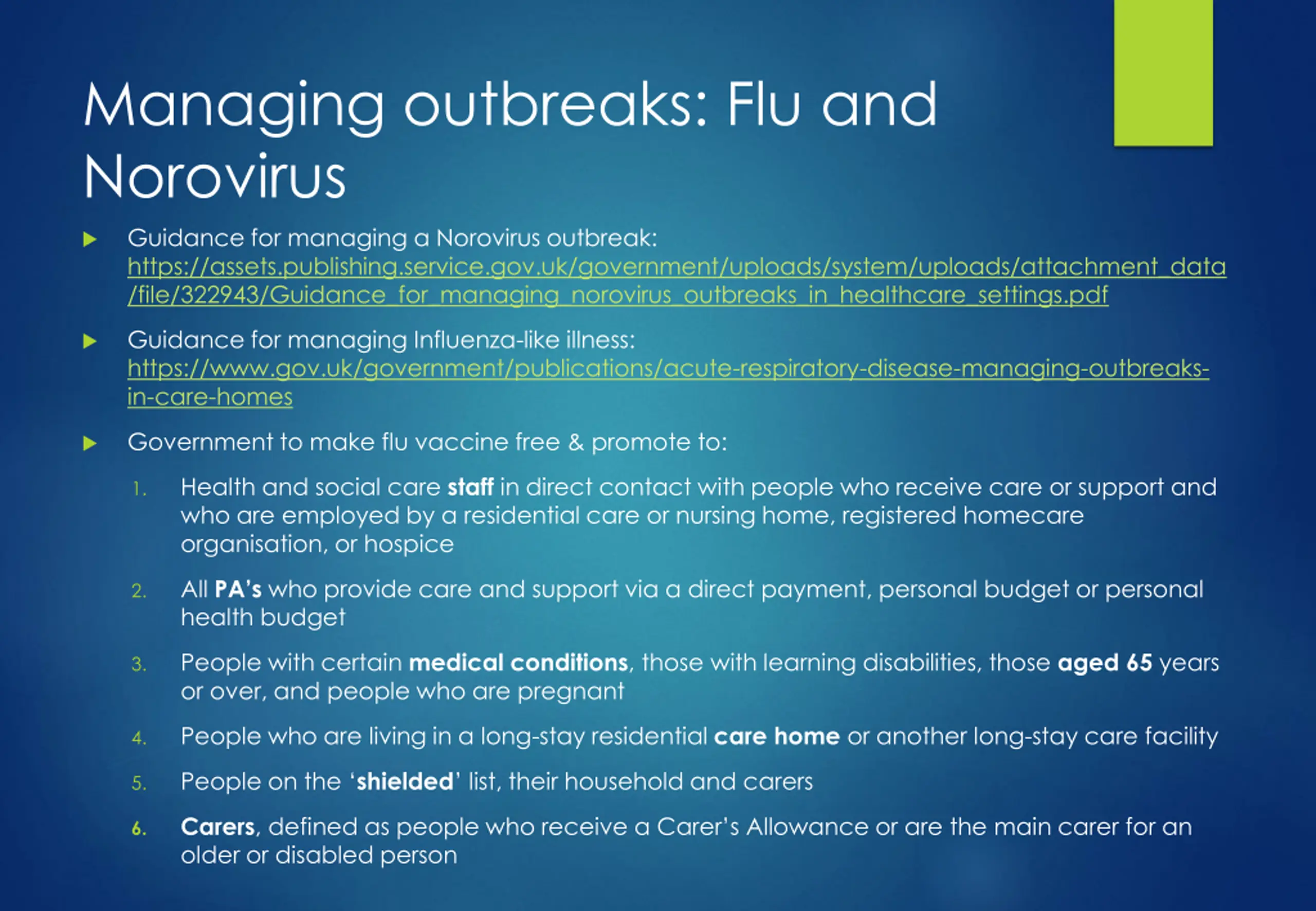 Managing outbreaks: Flu and Norovirus Guidance for managing a Norovirus outbreak: https://assets.publishing.service.gov.uk/government/uploads/system/uploads/attachment_data /file/322943/Guidance_for_managing_norovirus_outbreaks_in_healthcare_settings.pdf Guidance for managing Influenza-like illness: https://www.gov.uk/government/publications/acute-respiratory-disease-managing-outbreaks- in-care-homes Government to make flu vaccine free & promote to: Health and social care staff in direct contact with people who receive care or support and who are employed by a residential care or nursing home, registered homecare organisation, or hospice 1. All PA s who provide care and support via a direct payment, personal budget or personal health budget 2. People with certain medical conditions, those with learning disabilities, those aged 65 years or over, and people who are pregnant 3. People who are living in a long-stay residential care home or another long-stay care facility 4. People on the shielded list, their household and carers 5. Carers, defined as people who receive a Carer s Allowance or are the main carer for an older or disabled person 6.