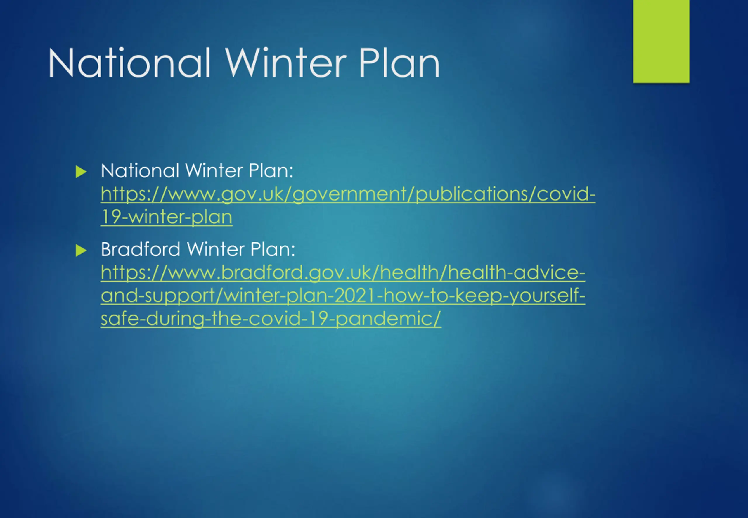 National Winter Plan National Winter Plan: https://www.gov.uk/government/publications/covid- 19-winter-plan Bradford Winter Plan: https://www.bradford.gov.uk/health/health-advice- and-support/winter-plan-2021-how-to-keep-yourself- safe-during-the-covid-19-pandemic/
