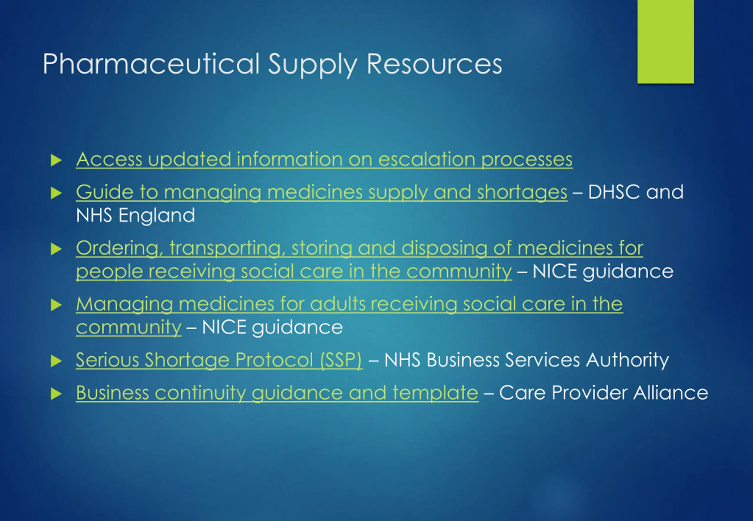 Pharmaceutical Supply Resources Access updated information on escalation processes Guide to managing medicines supply and shortages DHSC and NHS England Ordering, transporting, storing and disposing of medicines for people receiving social care in the community NICE guidance Managing medicines for adults receiving social care in the community NICE guidance Serious Shortage Protocol (SSP) NHS Business Services Authority Business continuity guidance and template Care Provider Alliance