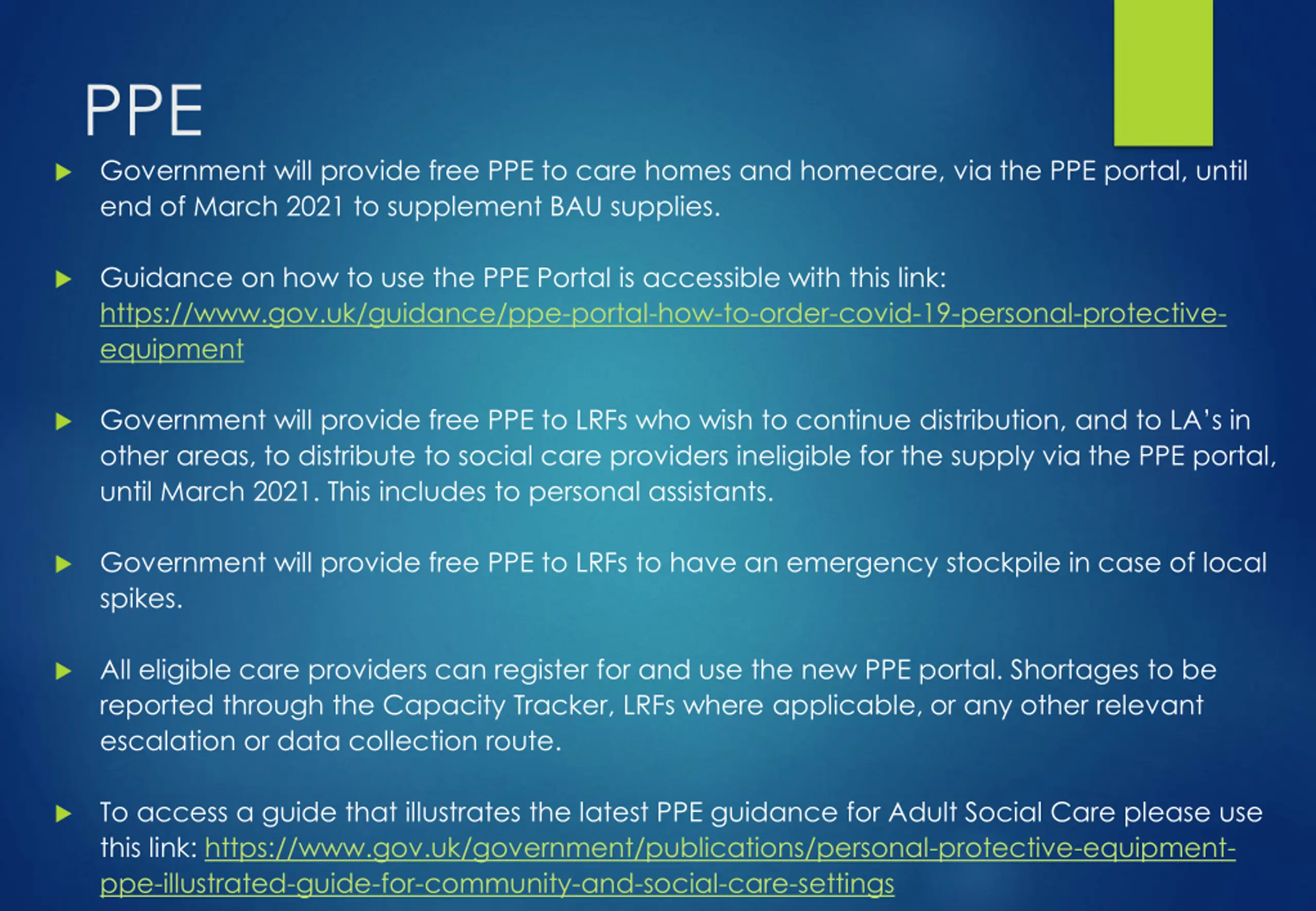 PPE Government will provide free PPE to care homes and homecare, via the PPE portal, until end of March 2021 to supplement BAU supplies. Guidance on how to use the PPE Portal is accessible with this link: https://www.gov.uk/guidance/ppe-portal-how-to-order-covid-19-personal-protective- equipment Government will provide free PPE to LRFs who wish to continue distribution, and to LA s in other areas, to distribute to social care providers ineligible for the supply via the PPE portal, until March 2021. This includes to personal assistants. Government will provide free PPE to LRFs to have an emergency stockpile in case of local spikes. All eligible care providers can register for and use the new PPE portal. Shortages to be reported through the Capacity Tracker, LRFs where applicable, or any other relevant escalation or data collection route. To access a guide that illustrates the latest PPE guidance for Adult Social Care please use this link: https://www.gov.uk/government/publications/personal-protective-equipment- ppe-illustrated-guide-for-community-and-social-care-settings